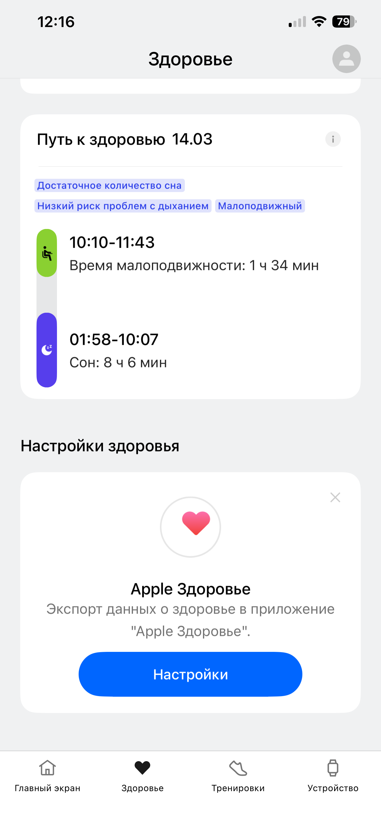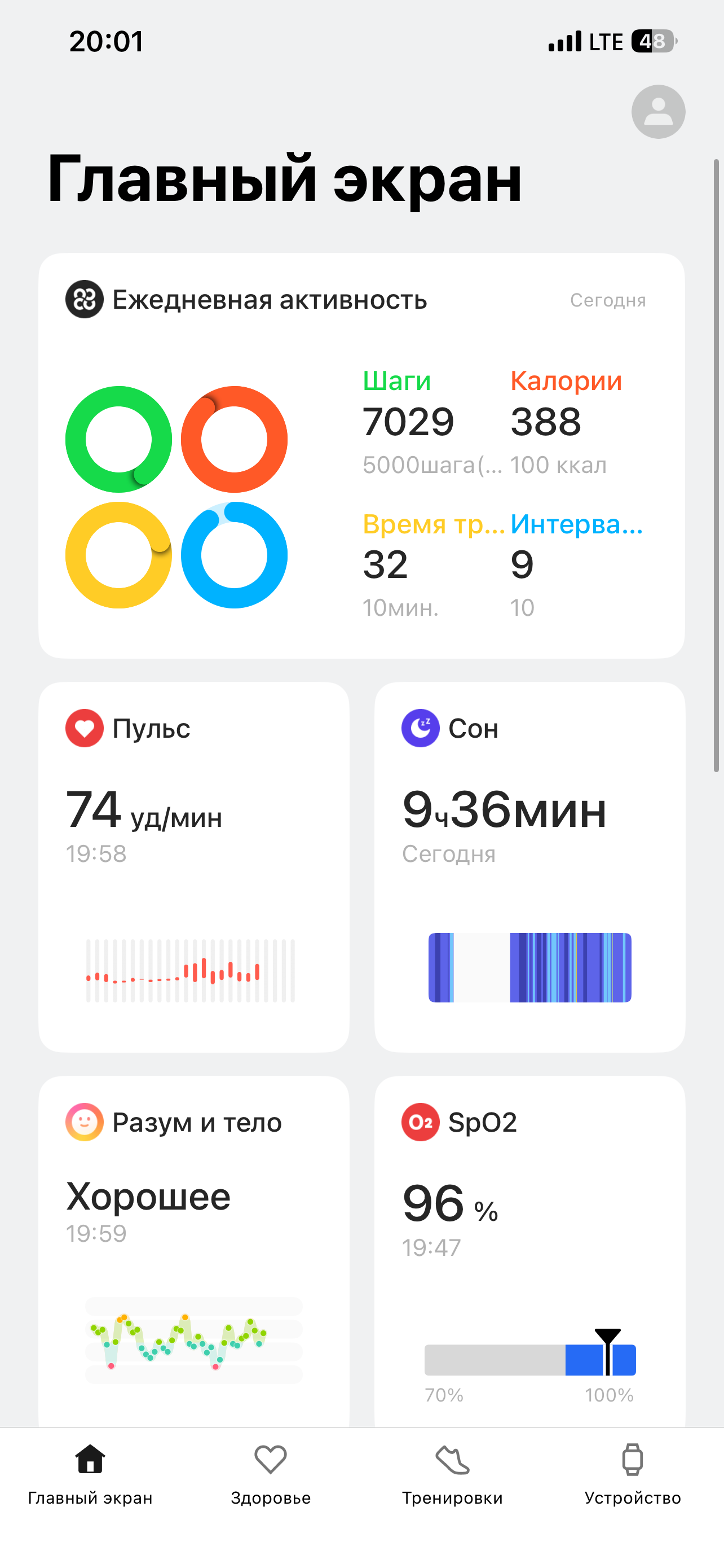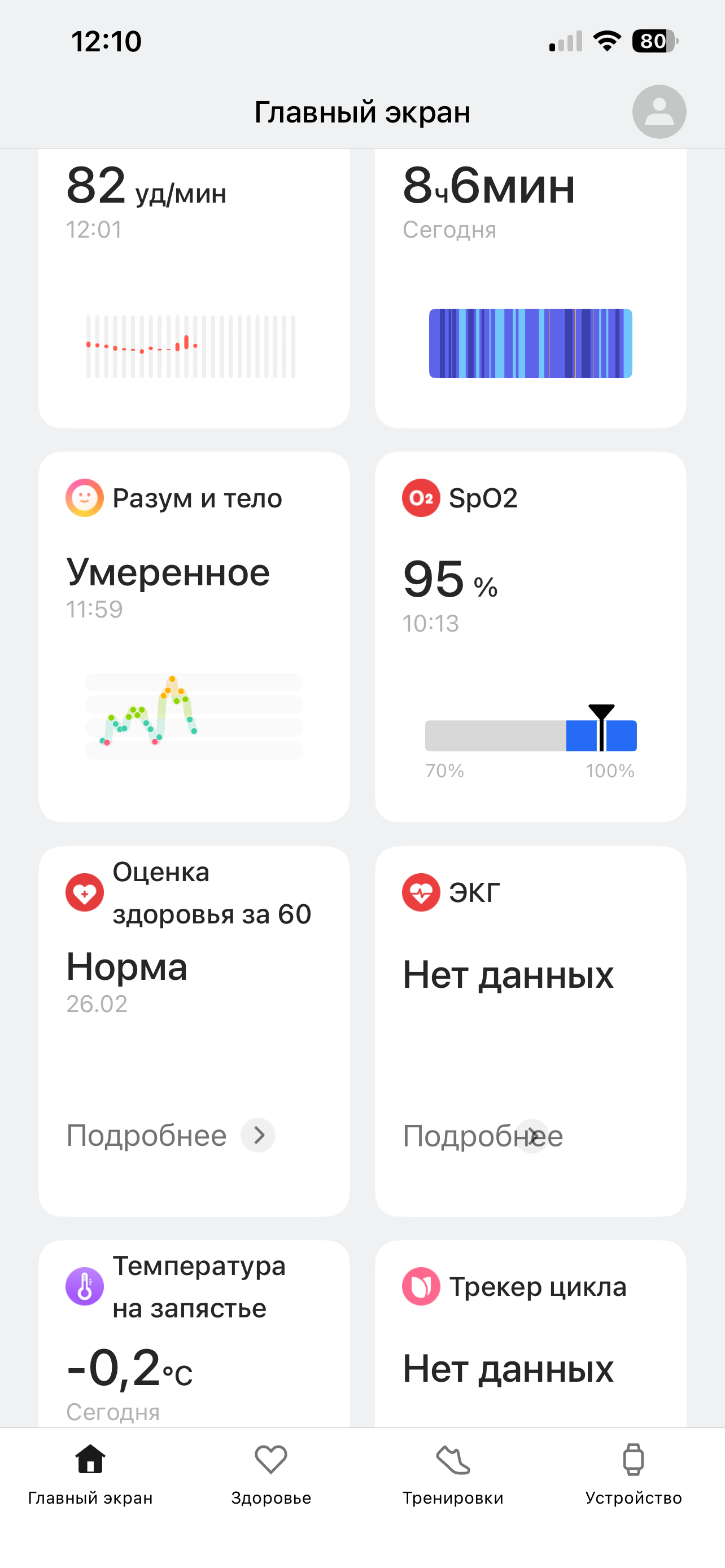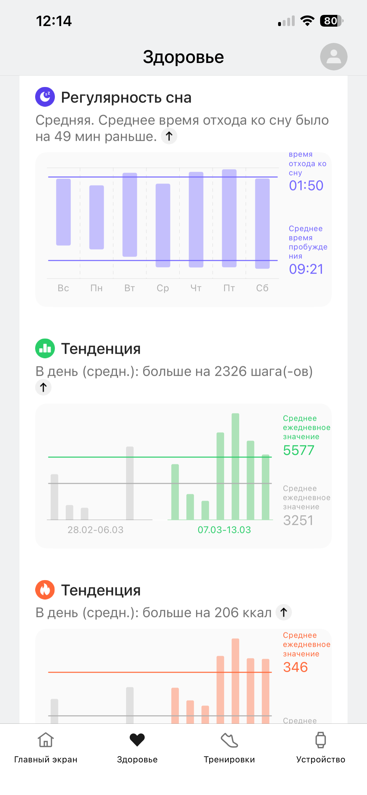 Интерфейс самого смартфонного приложения вполне стандартен. Главный экран — сводка данных о здоровье и активности (сон, пульс, шаги, калории, SpO₂ и так далее). Далее — «Здоровье». Здесь сводная аналитика (так называемые тенденции), призванная показать динамику вашей работы над собой. Стали ли вы лучше спать, больше двигаться и так далее. Чтобы всё это заработало, часы надо носить несколько дней.