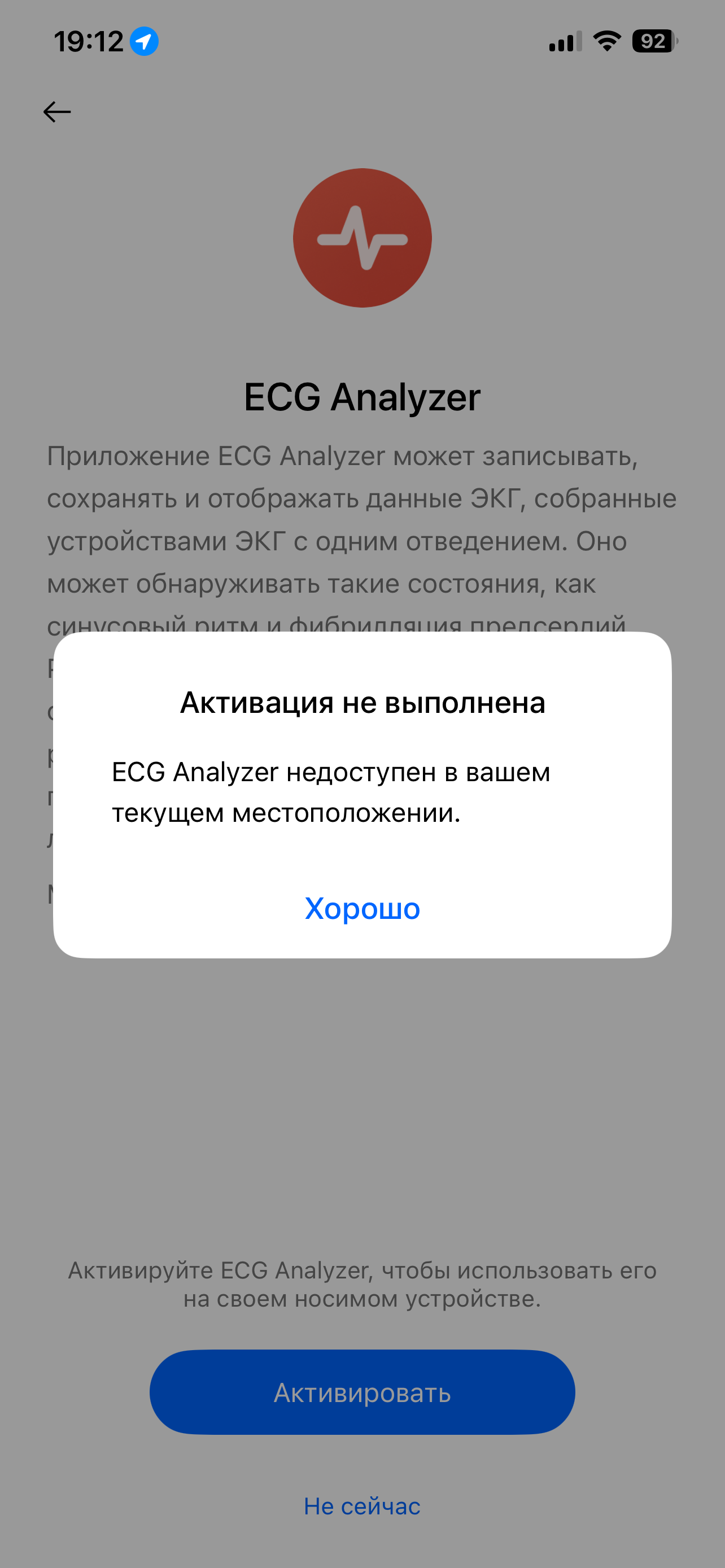 И второй момент. В процессе того же измерения артериальной жесткости часы снимают электрокардиограмму, однако ее результаты недоступны даже на самом устройстве! В смартфонном приложении же есть раздел ЭКГ, где предлагается активировать опцию, но при попытке это сделать мы видим сообщение, что «в текущем местоположении» это недоступно.