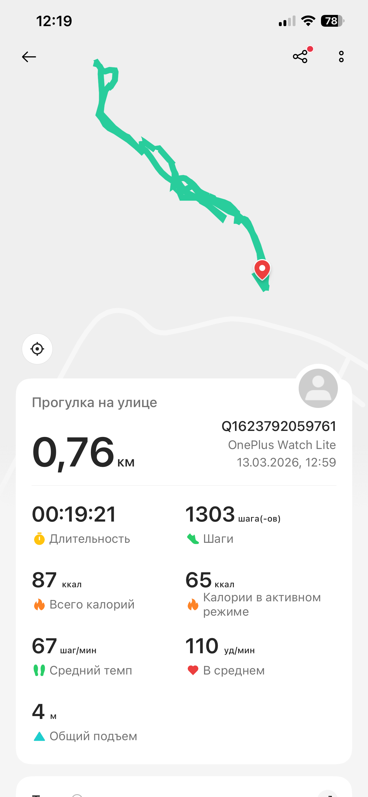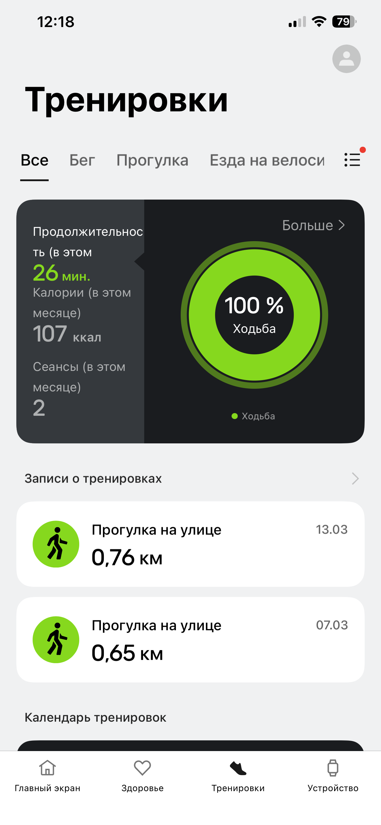 Далее идут «Тренировки». Здесь сводная информация о ваших тренировках. По каждой, разумеется, доступна подробная статистика и карта (если занятие было на улице), но карта эта не очень детализированная.