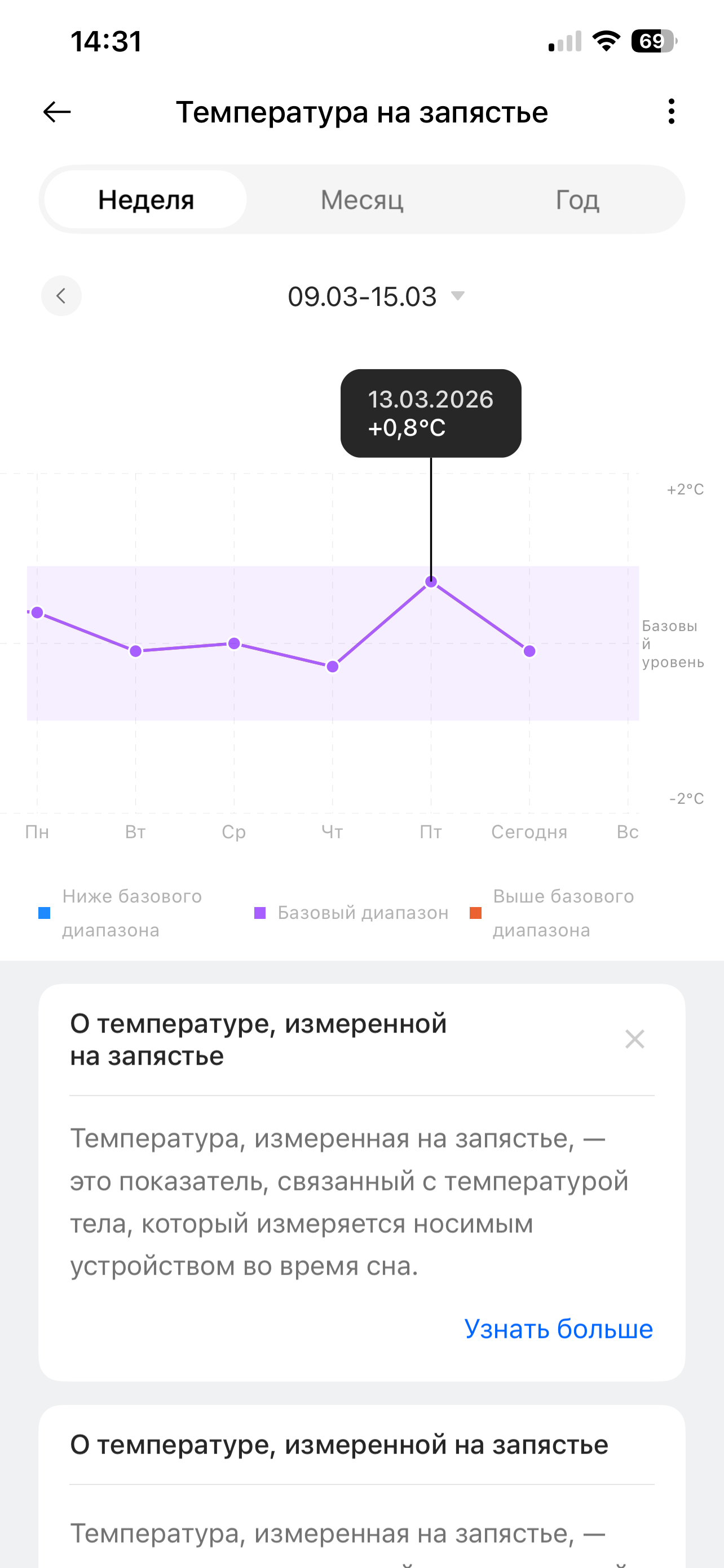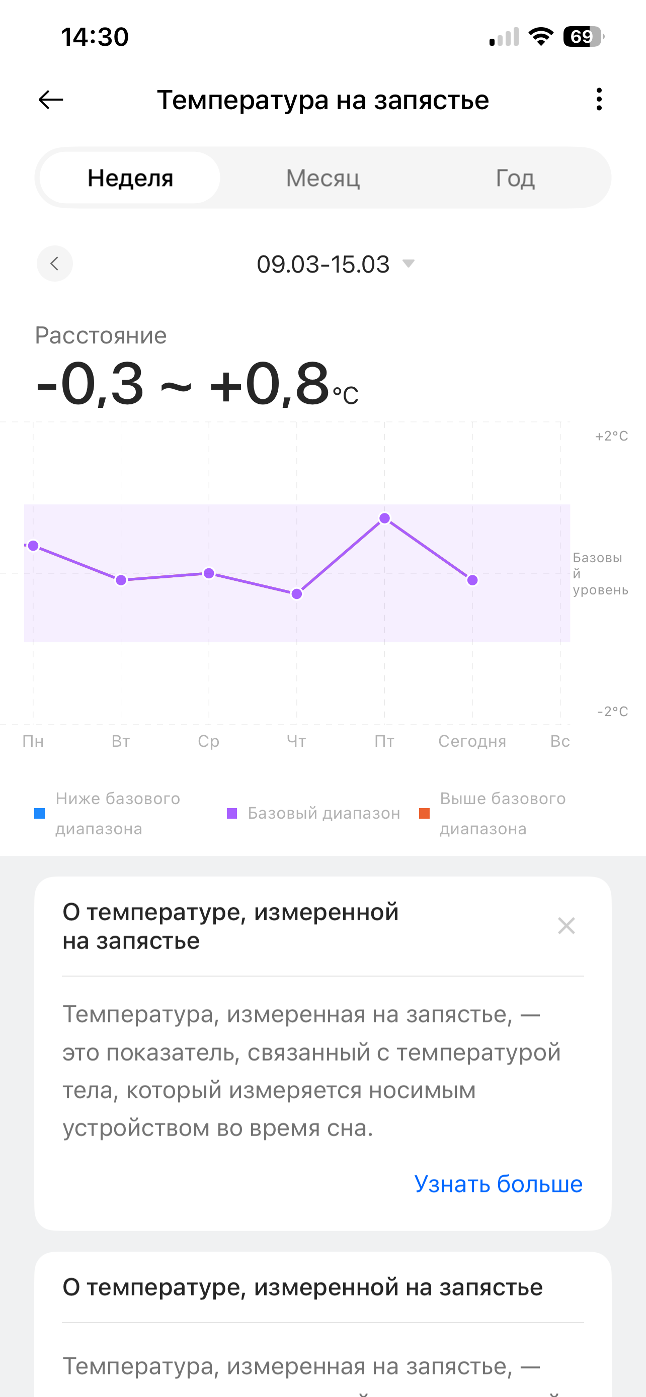В часах OnePlus гораздо более логично, чем в устройствах Huawei, реализовано определение температуры кожи тела. Если часы Huawei сообщают вам абсолютный показатель, и для обычного пользователя он не особенно полезен (например, вам говорят, что это 34,5 градуса: много это или мало? Мы же привыкли к магическому значению 36,6), то часы OnePlus демонстрируют относительные цифры и тут же дают их интерпретацию, а также объясняют, зачем это нужно.