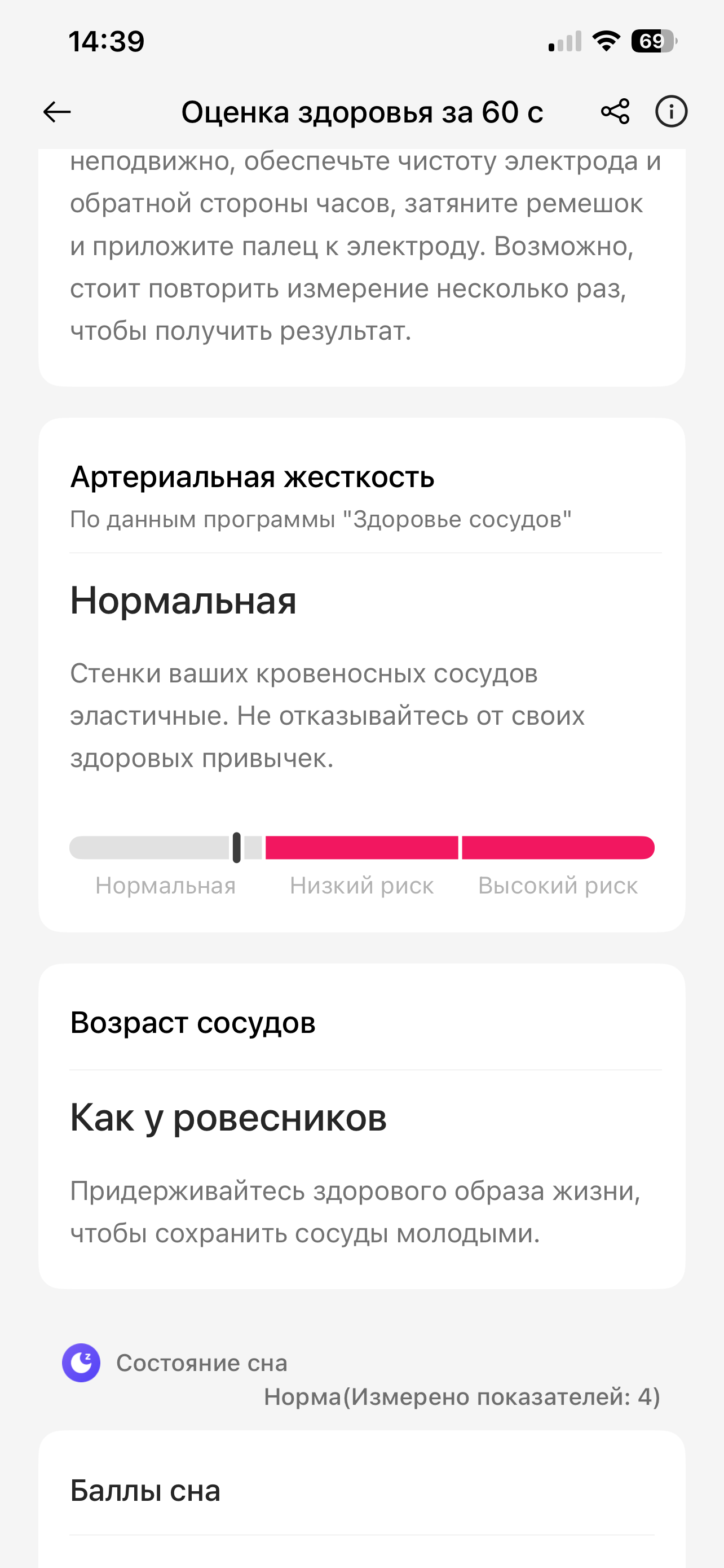 Еще из медицинских опций, выходящих за рамки базового набора, здесь есть определение артериальной жесткости. Мы знакомы с тем, что это такое, как раз по устройствам Huawei, но больше практически нигде не встречали. Как раз для данного измерения необходим электрод, про который мы писали в разделе о дизайне. Но вот что интересно. Во-первых, в смартфонном приложении мы не нашли список результатов измерений. Артериальная жесткость упоминается только в сводном тесте, объединяющем 13 показателей, но отдельные измерения, похоже, не передаются на смартфон.