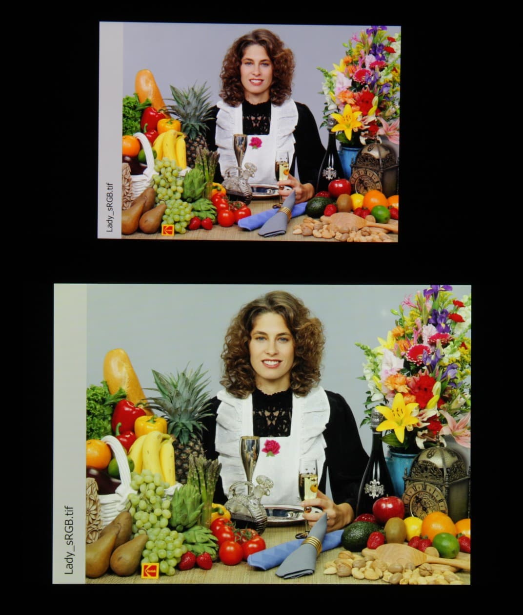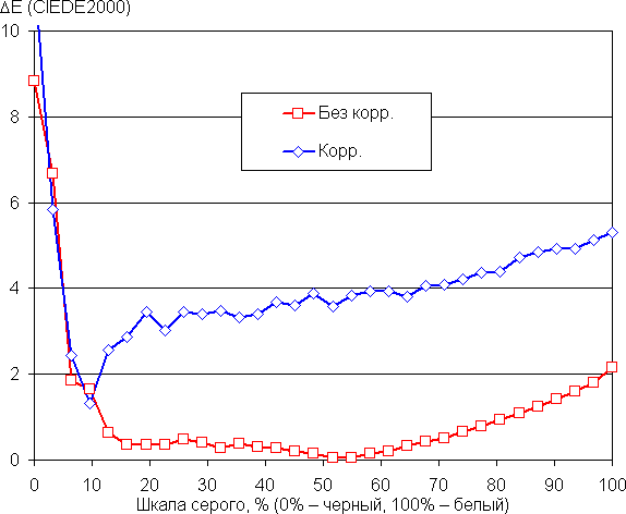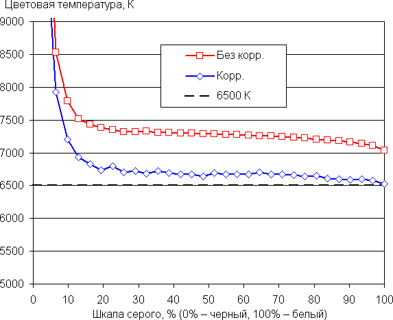 Результат после ручной коррекции хороший, так как цветовая температура становится достаточно близкой к стандартным 6500 К, а отклонение от спектра абсолютно черного тела (ΔE) остается ниже 10, что для потребительского устройства считается приемлемым показателем. При этом цветовая температура и ΔE мало изменяются от оттенка к оттенку — это положительно сказывается на визуальной оценке цветового баланса. (Самые темные области шкалы серого можно не учитывать, так как там баланс цветов не имеет большого значения, да и погрешность измерений цветовых характеристик на низкой яркости большая.)