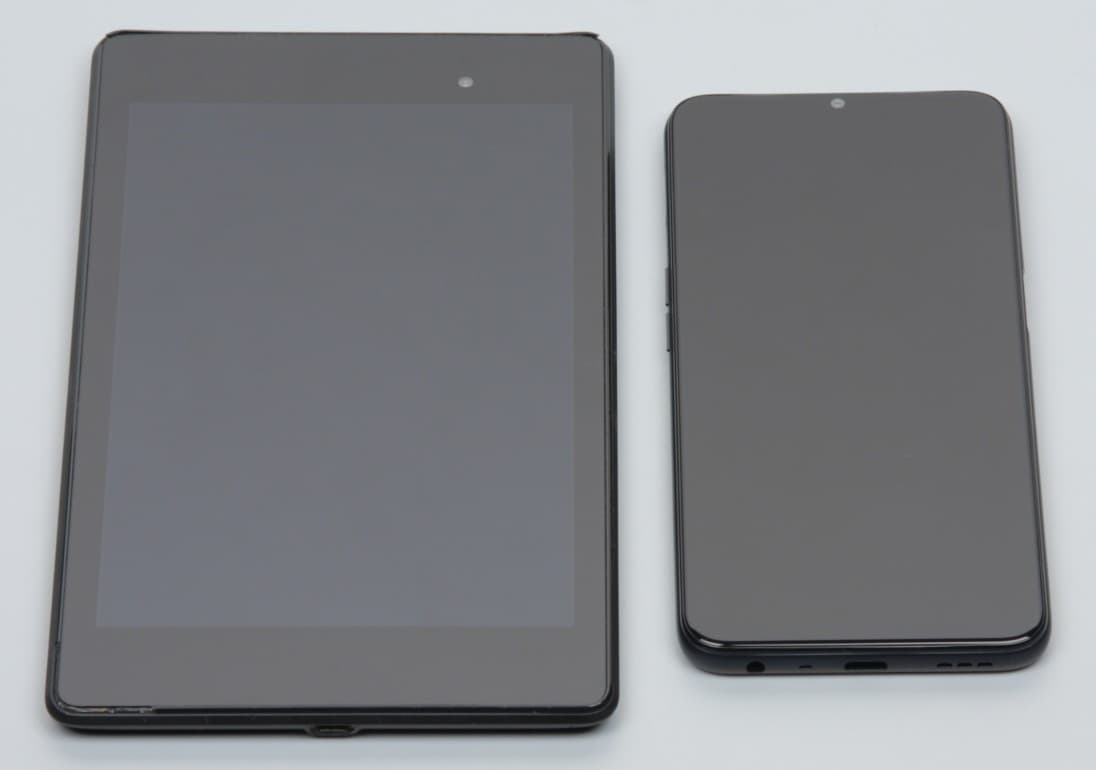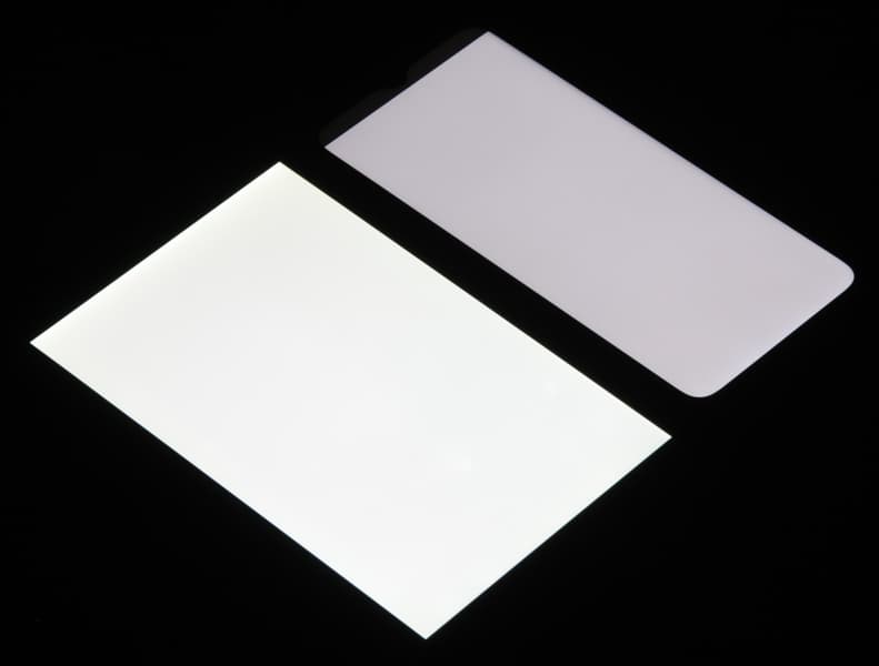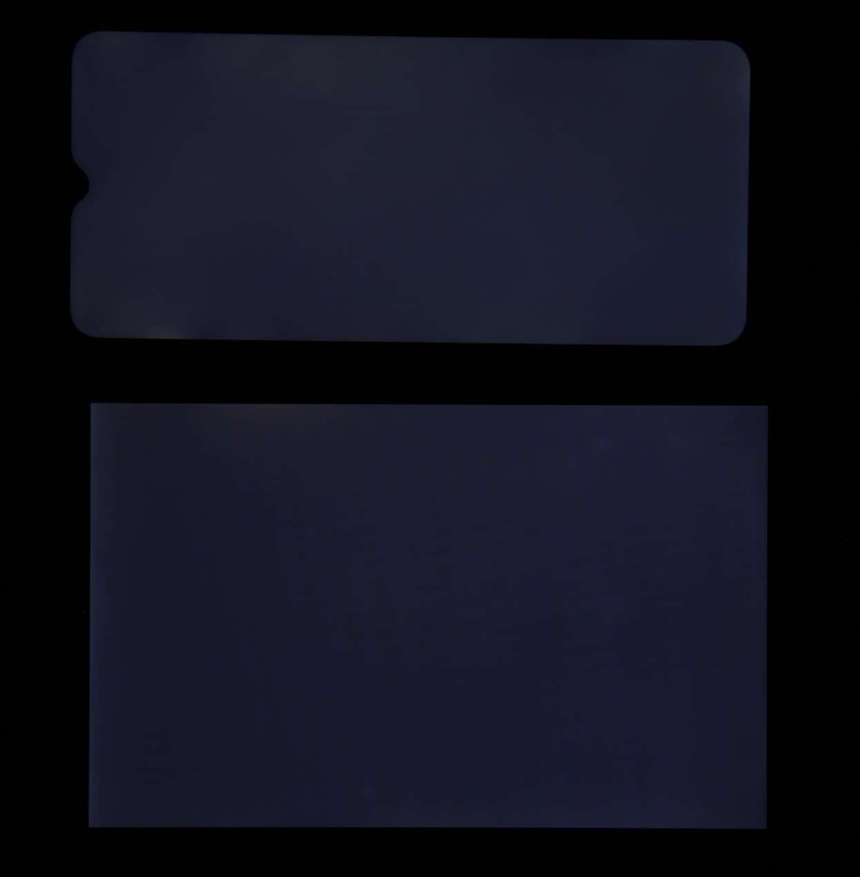 Лицевая поверхность экрана выполнена в виде стеклянной пластины с зеркально-гладкой поверхностью, устойчивой к появлению царапин. Судя по отражению объектов, антибликовые свойства экрана лучше, чем у экрана Google Nexus 7 (2013) (далее просто Nexus 7). Для наглядности приведем фотографию, на которой в выключенных экранах отражается белая поверхность (слева — Nexus 7, справа — Oppo A16, далее их можно различать по размеру):
