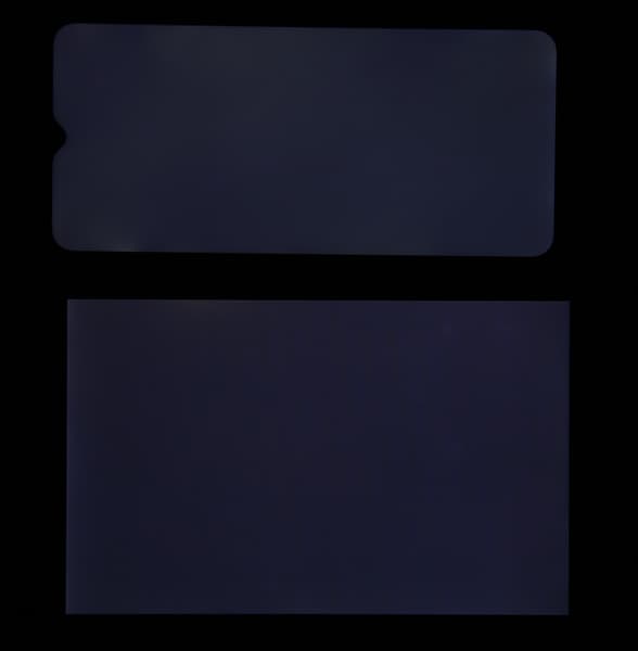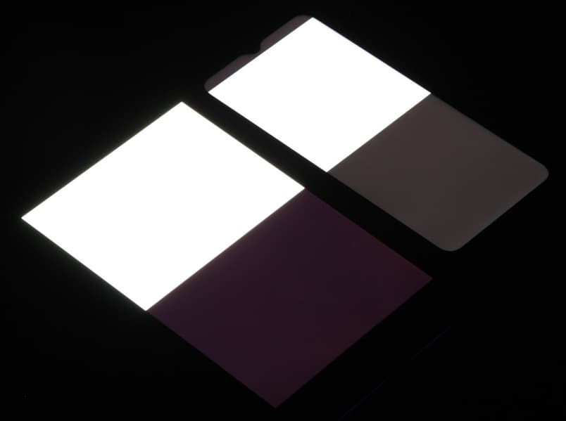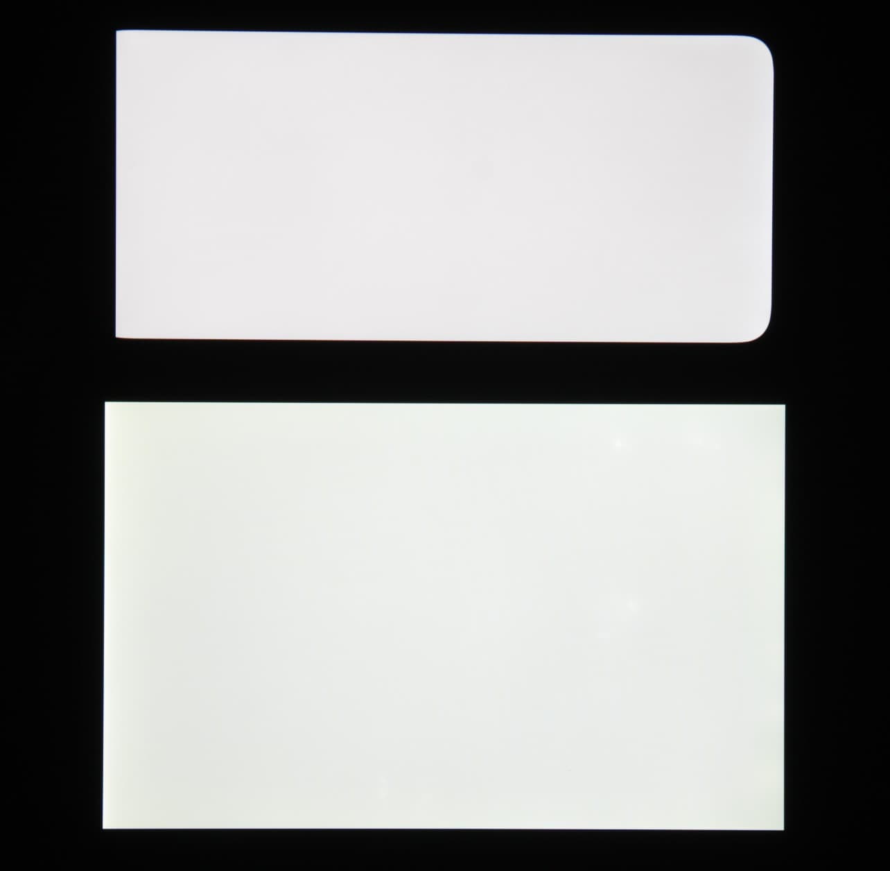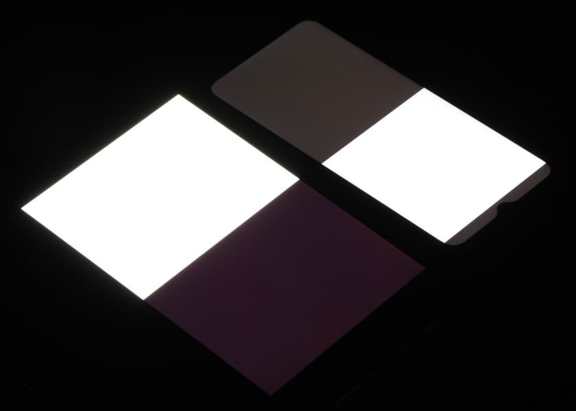 Яркость под углом у экранов уменьшилась (как минимум в 5 раз, исходя из разницы в выдержке), но у смартфона снижение яркости заметно больше. Черное поле при отклонении по диагонали сильно высветляется, но остается условно нейтрально-серым по оттенку. Фотографии ниже это демонстрируют (яркость белых участков в перпендикулярном плоскости экранов направлении одинаковая!):