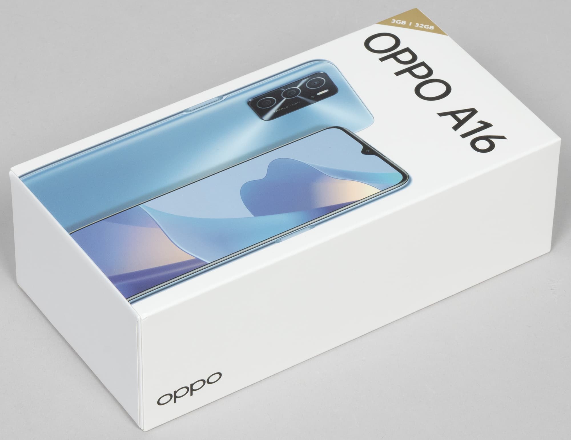 Oppo A16 поставляется в твердой картонной упаковке с цветной печатью.