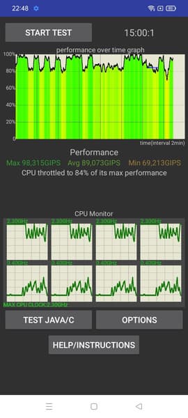 Тестирование традиционно проводилось на обычном уровне энергопотребления без использования функций энергосбережения, хотя таковые в аппарате имеются. Условия тестирования: выставлен минимальный комфортный уровень яркости (примерно 100 кд/м²). Тесты: беспрерывное чтение в программе Moon+ Reader (со стандартной, светлой темой); беспрерывный просмотр видео в HD-качестве (720р) через домашнюю сеть Wi-Fi; игра Injustice 2 с автонастройками графики.