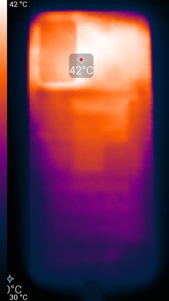 Нагрев выше в верхней части аппарата, что, видимо, соответствует расположению микросхемы SoC. По данным теплокамеры, максимальный нагрев составил 42 градуса (при температуре окружающего воздуха в 24 градуса). Такой нагрев нельзя назвать незначительным.