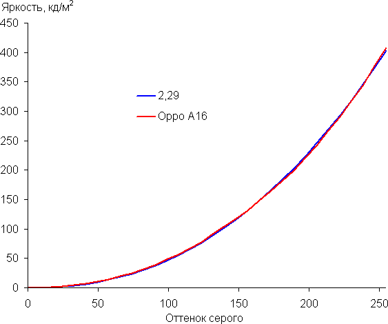 Контрастность (примерно в центре экрана) высокая — порядка 1500:1. Время отклика при переходе черный-белый-черный равно 16 мс (8 мс вкл. + 8 мс выкл.). Переход между полутонами серого 25% и 75% (по численному значению цвета) и обратно в сумме занимает 26 мс. Построенная по 32 точкам с равным интервалом по численному значению оттенка серого гамма-кривая не выявила завала ни в светах, ни в тенях. Показатель аппроксимирующей степенной функции равен 2,29, что немного выше стандартного значения 2,2. При этом реальная гамма-кривая немного отклоняется от степенной зависимости: