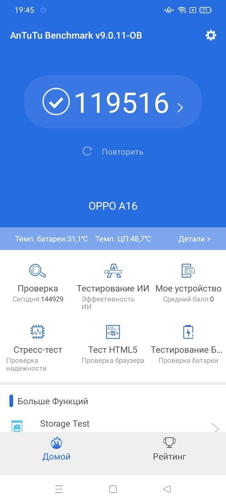 Oppo A16 получил встроенную батарею с большим даже по теперешним меркам объемом. Автономность аппарат демонстрирует максимальную, но это еще и потому, что нет здесь ни мощной аппаратной начинки, ни высокого разрешения экрана. Игры идут только на низких настройках графики, так что активно тратить энергию аппарату просто некуда.