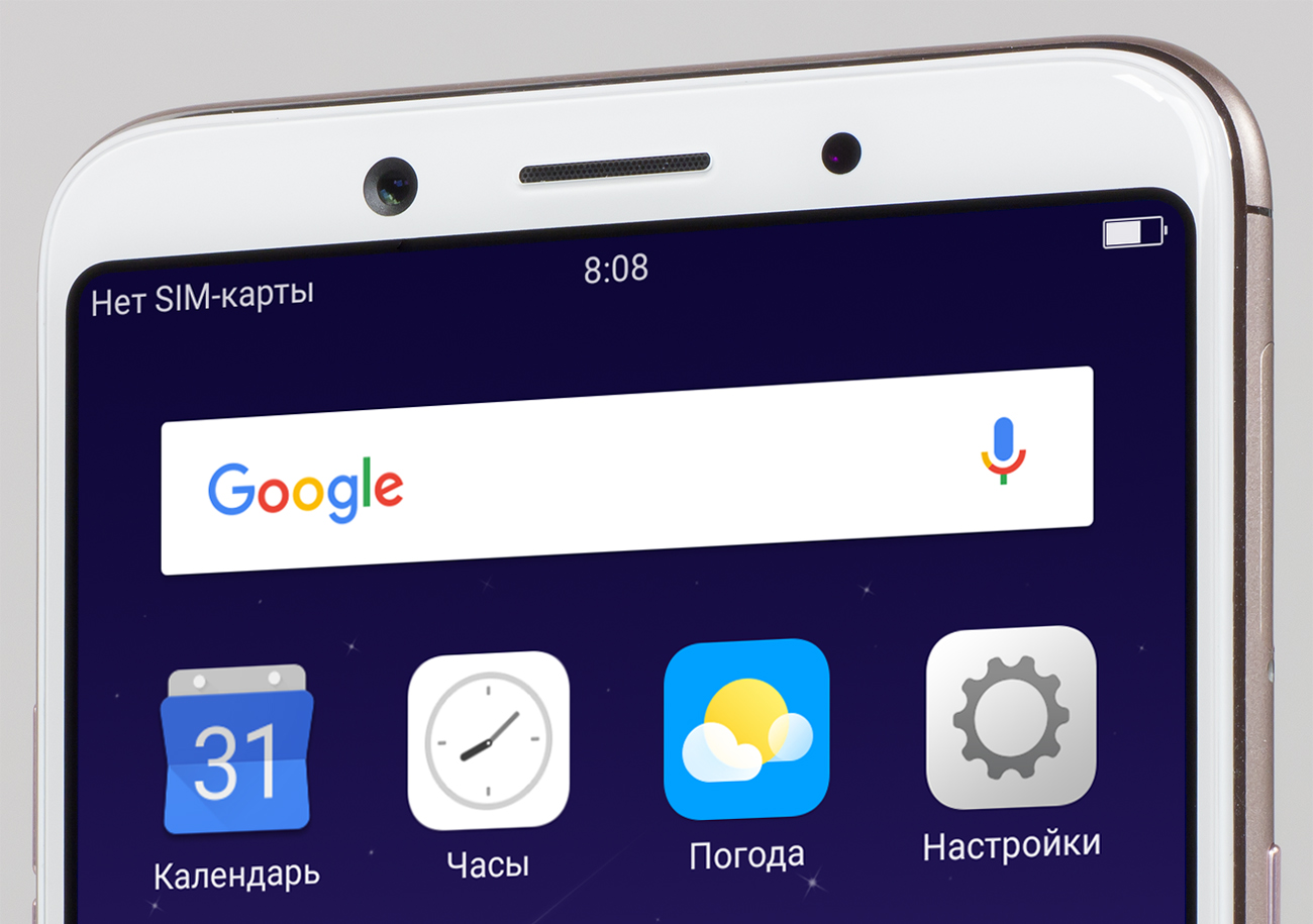 Oppo F5 оснащен дисплеем IPS, прикрытым 2.5D-стеклом с загнутыми краями. Физические размеры экрана составляют 68×136 мм при диагонали 6 дюймов. Разрешение дисплея — 2160×1080 (18:9), то есть с плотностью точек тут все хорошо, она составляет около 403 ppi. Рамка вокруг экрана довольно узкая, но вместе с сильно выпирающими боковинами расстояние от краев экрана до габаритных краев корпуса составляет по бокам не менее 3,5 мм, а сверху и снизу — примерно по 1 см.