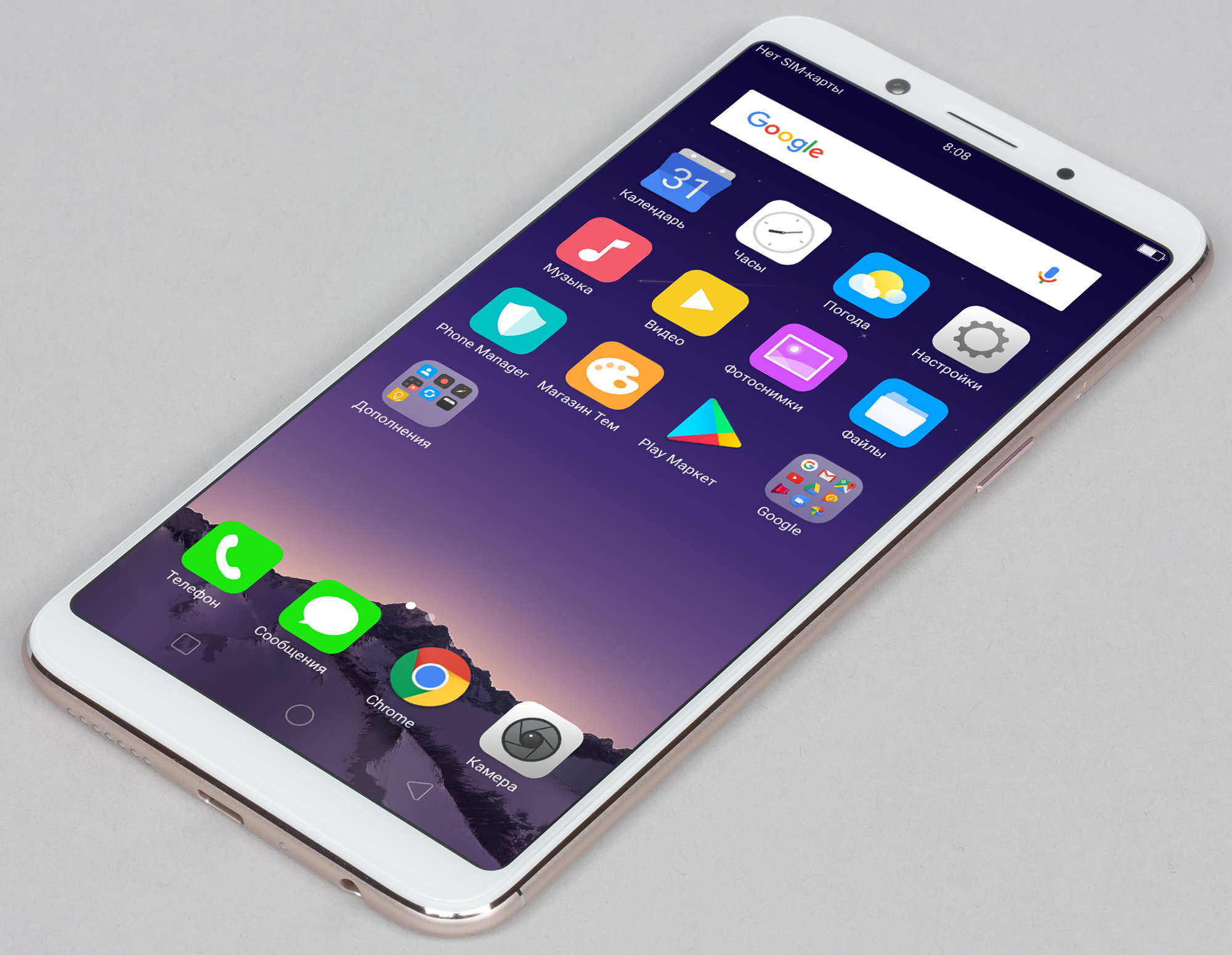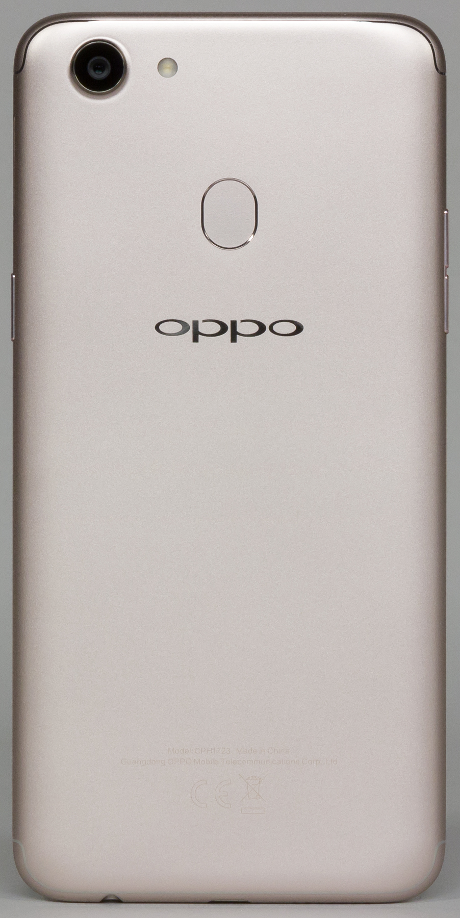 Тонкие линии на верхнем и нижнем торцах — это не привычные фигурные канавки для внешних антенн, а всего лишь элемент украшения, выточки для красоты. Куда на самом деле спрятали антенны, не совсем понятно — а быть может, материал корпуса вообще не металл, а какой-нибудь металлизированный пластик. По крайней мере, сам производитель нигде не утверждает прямо, что корпус у Oppo F5 цельнометаллический.