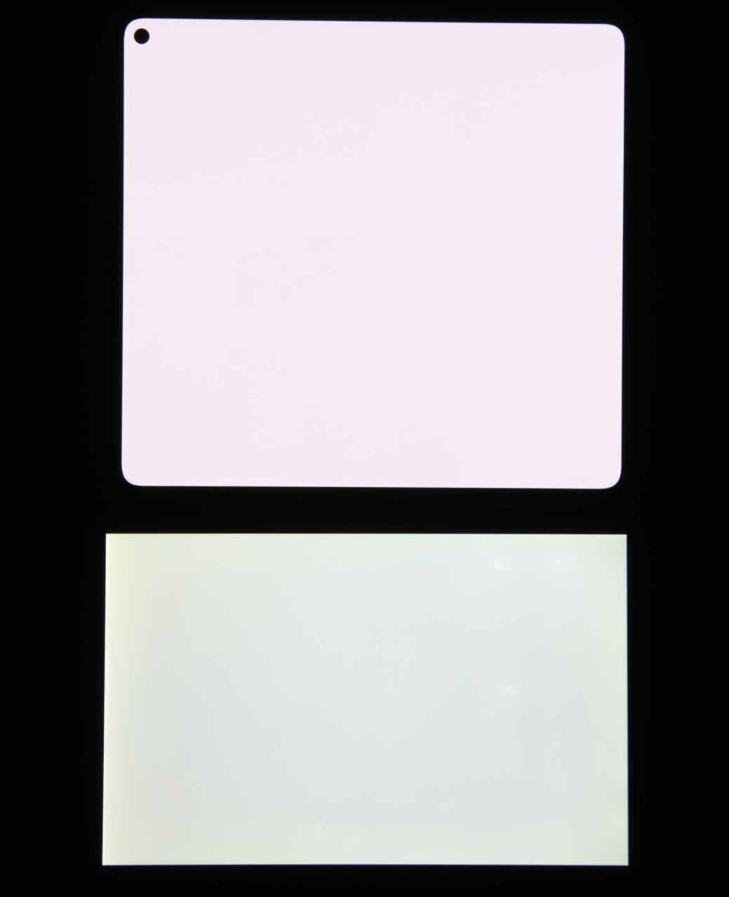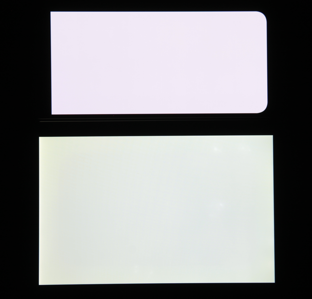 Экраны характеризуются великолепными углами обзора. Правда, белый цвет при отклонении на большие углы приобретает легкий сине-зеленый оттенок (у основного экрана это выражено чуть сильнее), но черный цвет остается просто черным под любыми углами. Он настолько черный, что параметр контрастности в данном случае неприменим. Для сравнения приведем фотографии, на которых на экраны смартфона и второго участника (Nexus 7; снизу — Nexus 7, сверху — смартфон, далее их можно различать по размеру) выведены одинаковые изображения, при этом яркость экранов изначально установлена примерно на 200 кд/м², а цветовой баланс на фотоаппарате принудительно переключен на 6500 К.