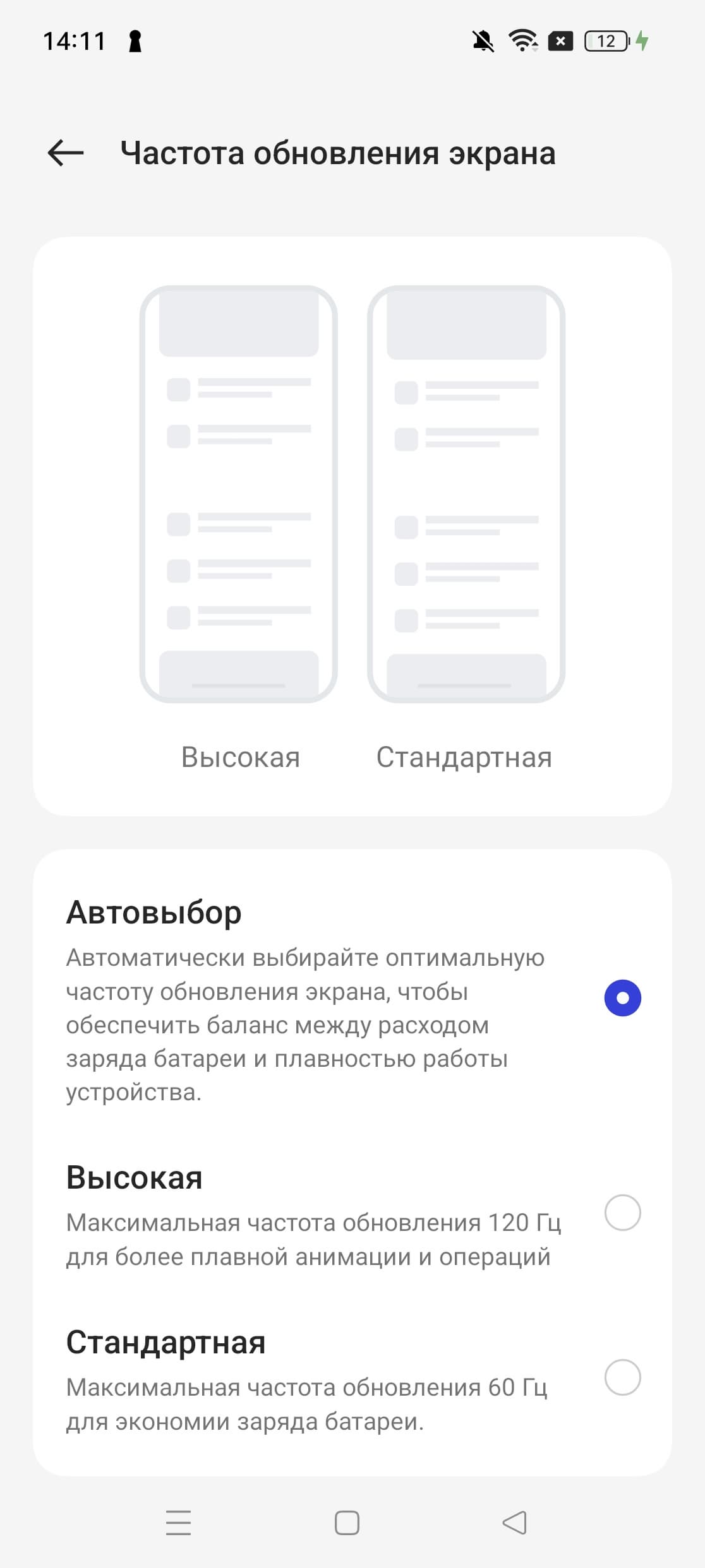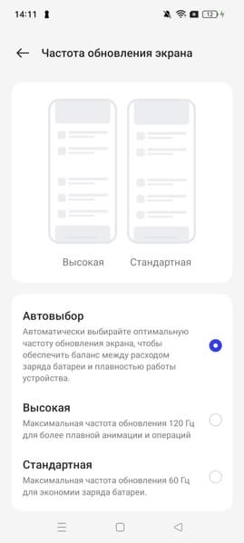 В настройках экрана можно включить режим с повышенной до 120 Гц частотой обновления (дополнительно для конкретных приложений можно выбрать и 90 Гц):
