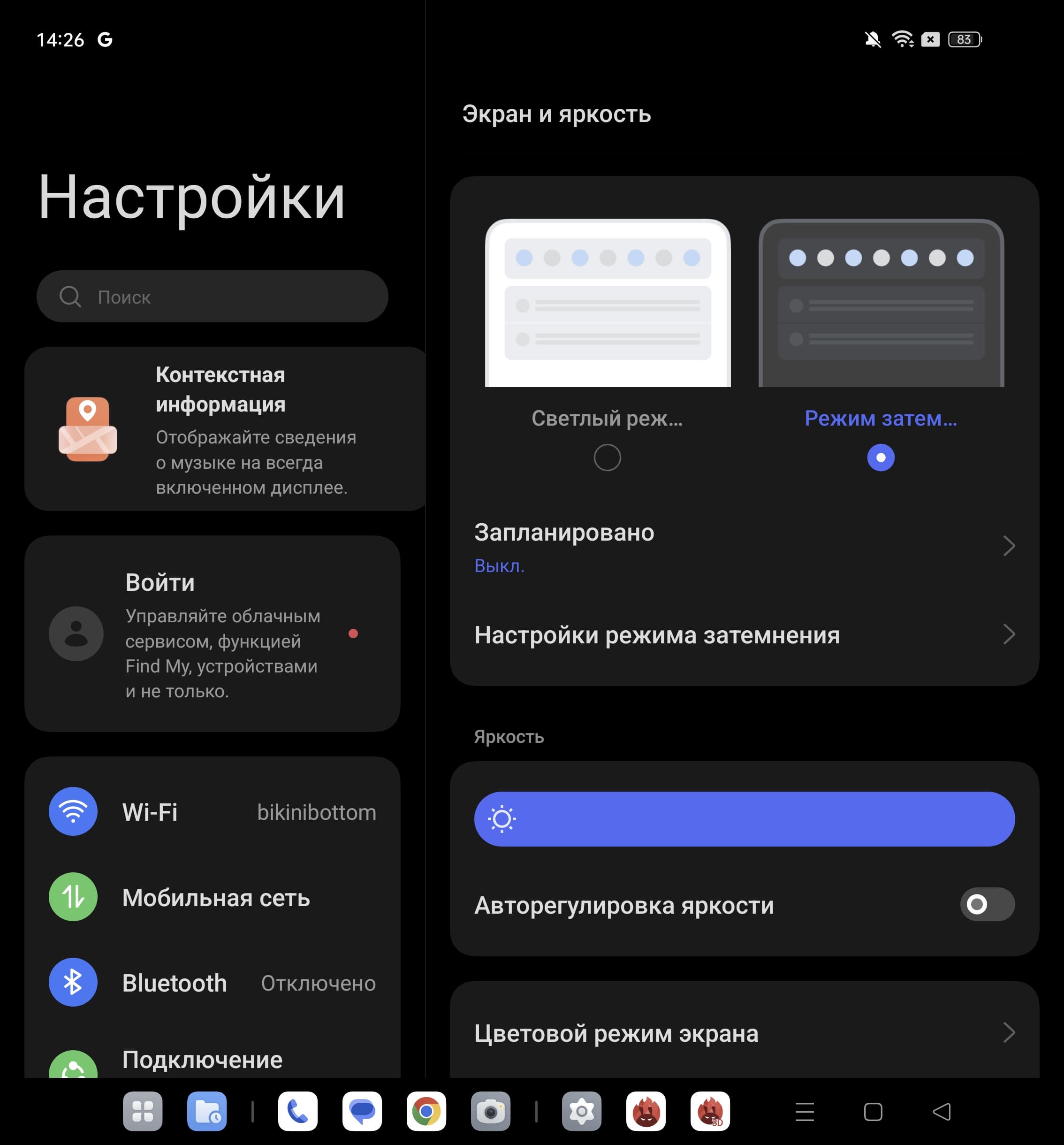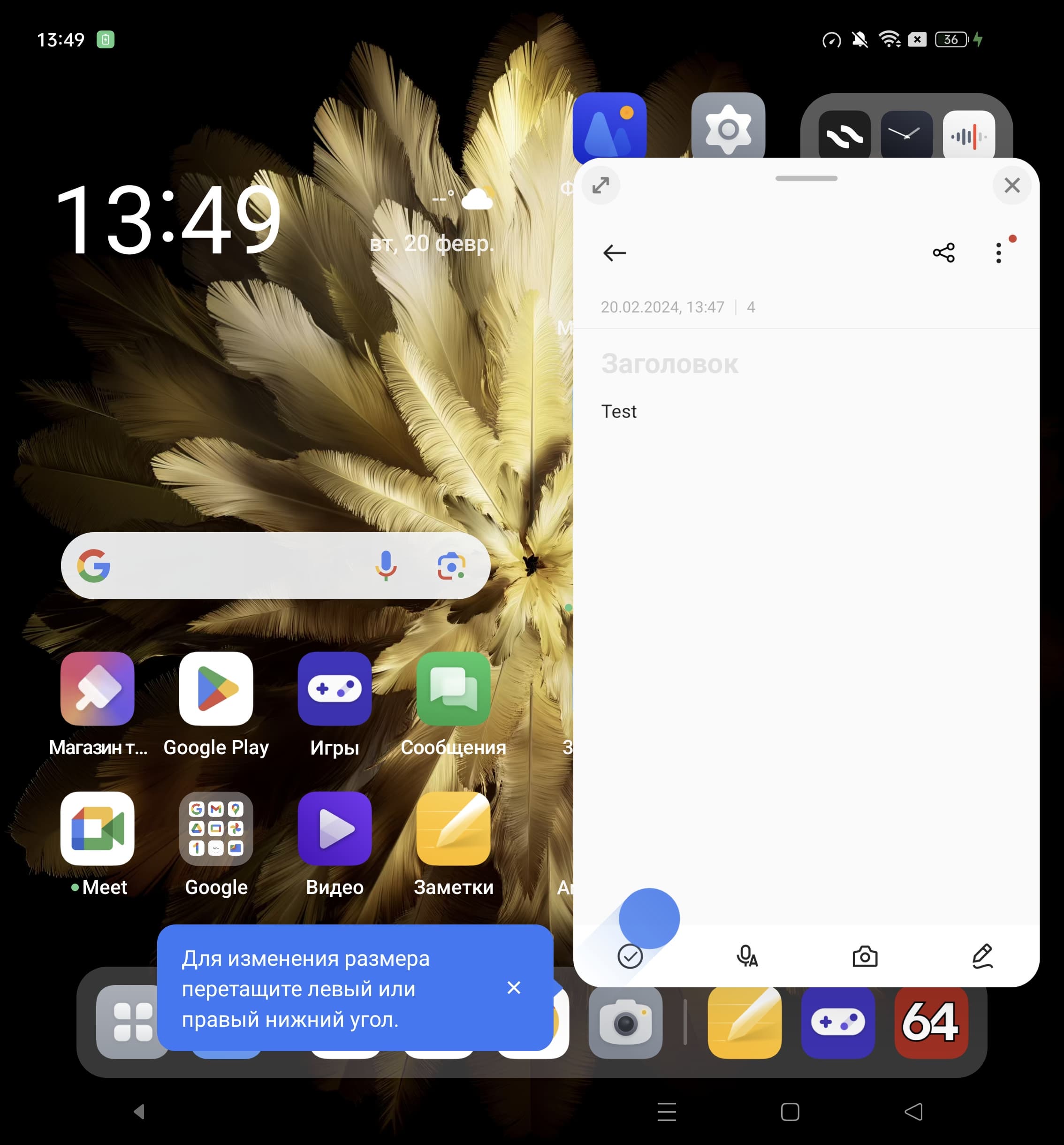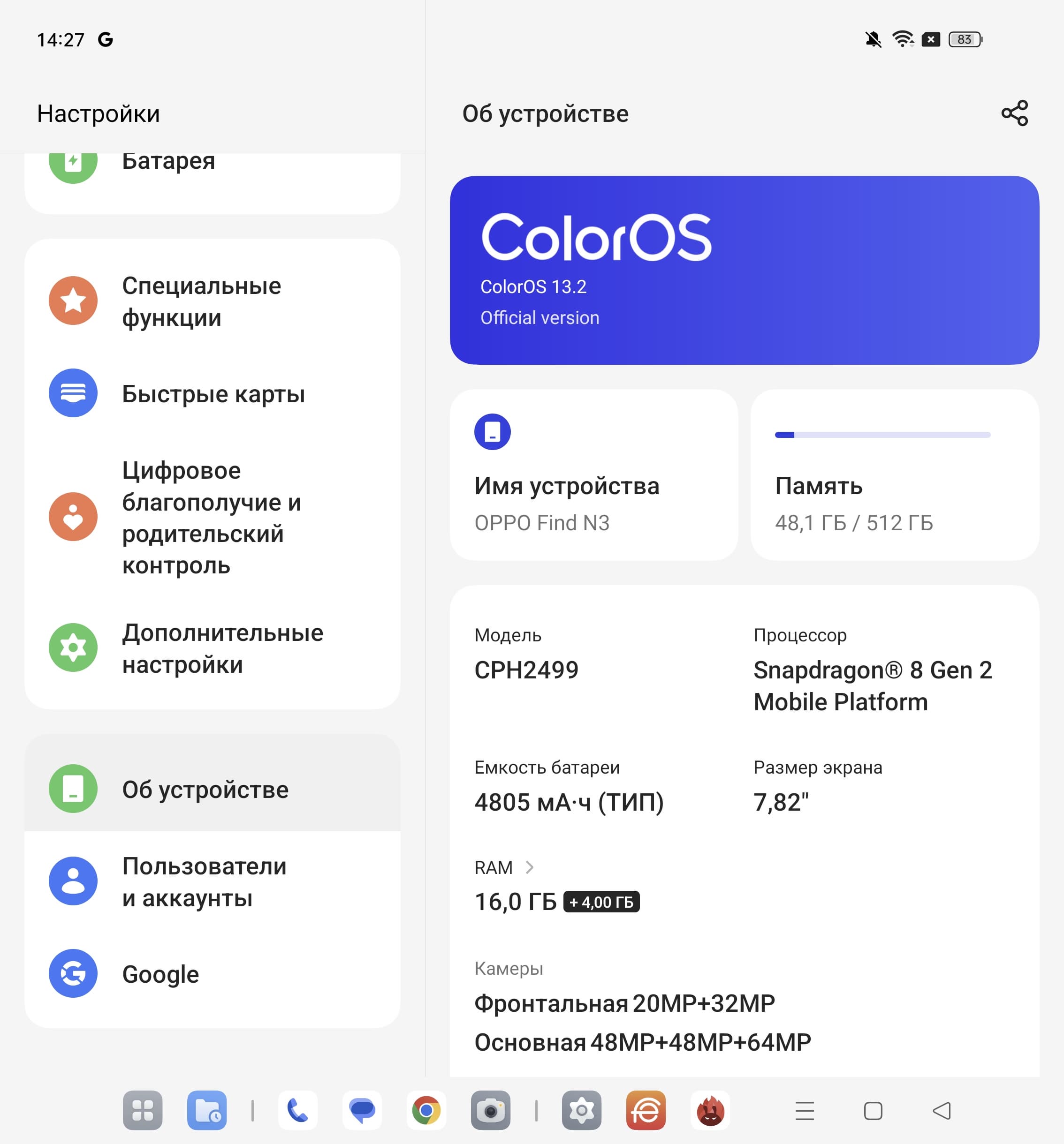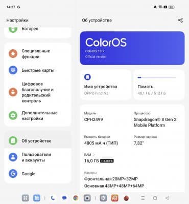 В качестве программной платформы Oppo Find N3 используется ОС Android 14 с собственной оболочкой ColorOS 14. Это добротный хорошо оптимизированный интерфейс с долгой историей развития, за много лет обросший массой дополнительных режимов и функций. В данном случае удобно использовать режим многозадачности с плавающими окнами и режим разделения экрана. Верхняя шторка не разделена на две части в зависимости от места оттягивания. Она единая, телескопическая. Имеется полная поддержка сервисов Google и магазин Google Play Store.