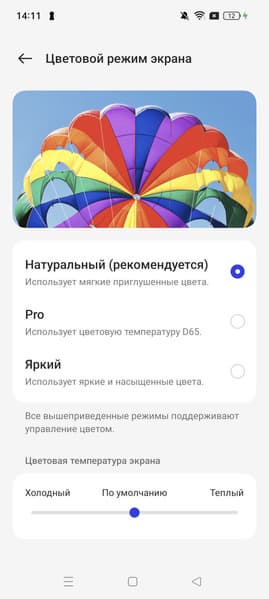 Фотография выше получена для профиля Натуральный в настройках экрана, который выбран по умолчанию. Профилей всего три:
