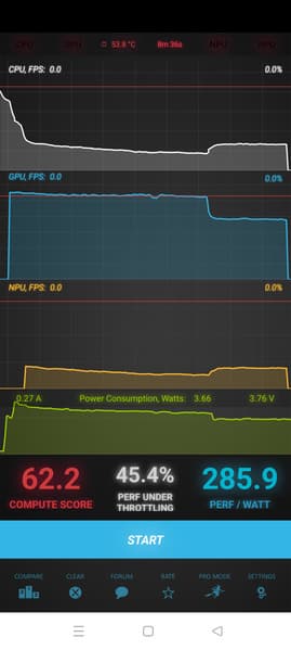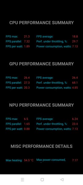 Тест на снижение производительности при нагреве мы проводим с помощью программы Burnout Benchmark, которая позволяет нагружать CPU, GPU и NPU:
