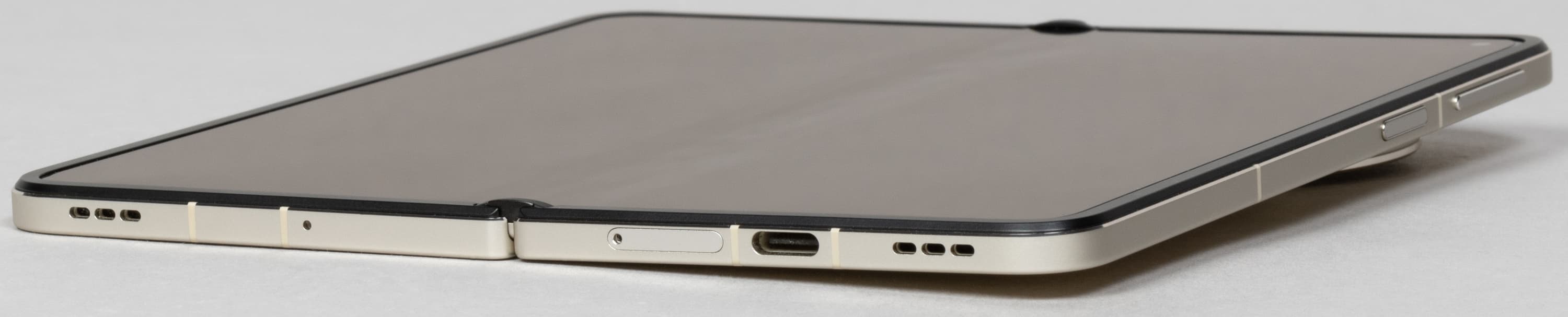 На нижнем торце установлены целых четыре динамика, а также микрофоны, выдвижной лоток для карточек и разъем USB Type-C. 3,5-миллиметрового аудиовыхода для миниджека проводных наушников нет.