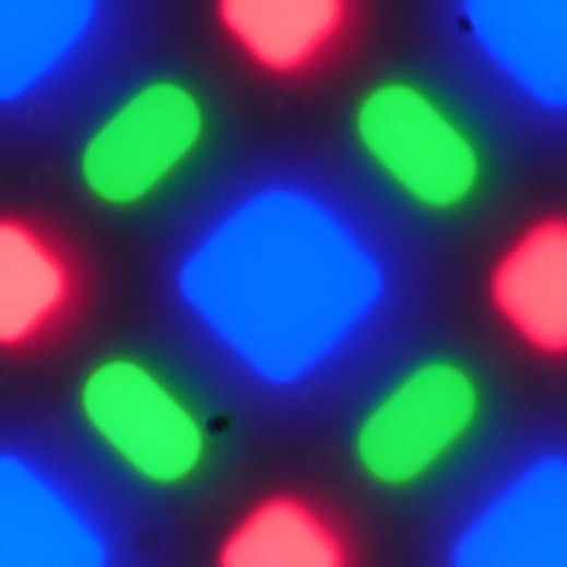 На фрагменте выше можно насчитать 4 зеленых субпикселя, 2 красных (4 половинки) и 2 синих (1 целый и 4 четвертушки), при этом, повторяя эти фрагменты, можно выложить весь экран без разрывов и перехлеста. Для таких матриц компания Samsung ввела наименование PenTile RGBG. Разрешение экрана производитель считает по зеленым субпикселям, по двум другим оно будет ниже. Разумеется, присутствуют некоторая неровность контрастных границ и другие артефакты. Впрочем, из-за высокого разрешения они лишь минимально сказываются на качестве изображения.
