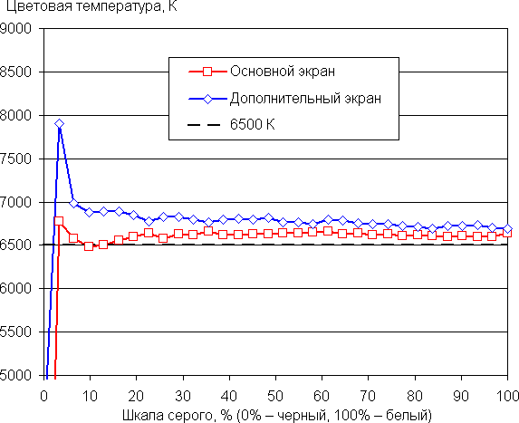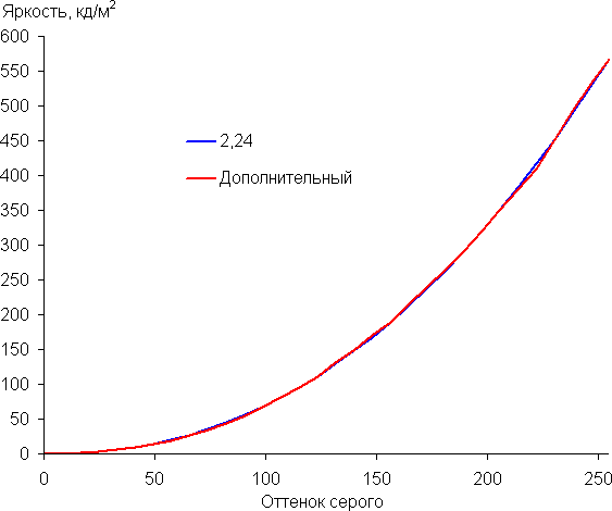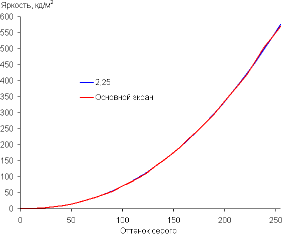 Построенная по 32 точкам с равным интервалом по численному значению оттенка серого гамма-кривая показала, что существенного завала нет ни в светах, ни в тенях. Показатель аппроксимирующей степенной функции равен 2,25 у основного экрана и 2,24 у дополнительного экрана, что близко к стандартному значению 2,2. При этом в обоих случаях реальная гамма-кривая мало отклоняется от степенной зависимости: