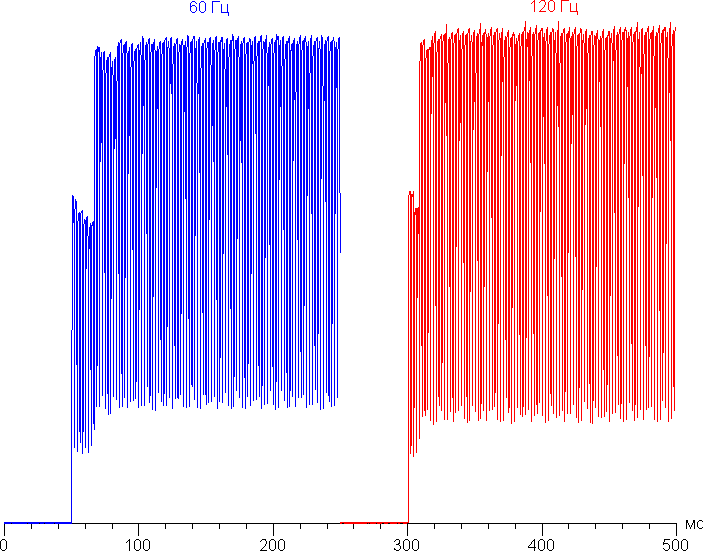 В режиме 120 Гц плавность прокрутки списков меню заметно повышается. При этом характер модуляции не меняется. Заметим, что независимо от выбранного режима, если не касаться экрана, то частота обновления все равно снижается.