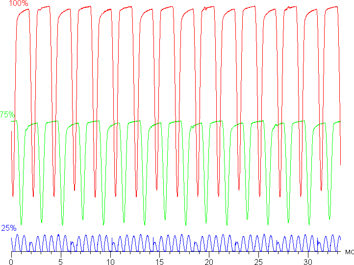 На высоком и среднем уровне яркости присутствует значимая модуляция с частотой примерно 480/360 Гц. На рисунках ниже приведены зависимости яркости (вертикальная ось) от времени (горизонтальная ось) для нескольких значений настройки яркости: