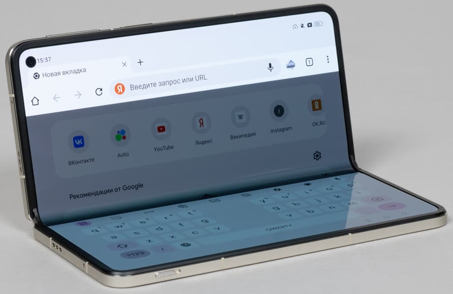 Раскрываются половинки с небольшим усилием, далее шарнир удерживает их в разных положениях достаточно уверенно, а с приближением к двум крайним начинает действовать доводчик. В целом, к механизму раскрытия никаких претензий. Можно, например, положить полураскрытый смартфон на стол и вести съемку на тыльные камеры или организовать видеоконференцию с помощью селфи-камеры, встроенной во внутренний экран.