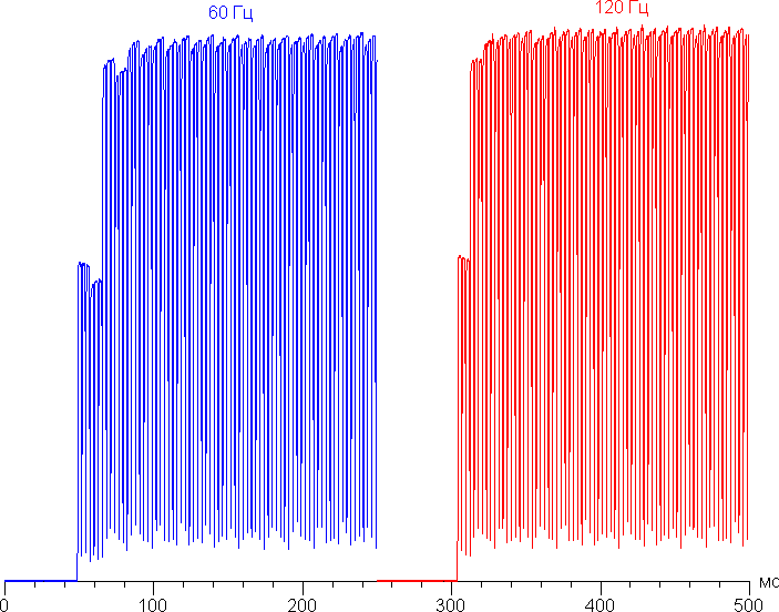 Переключение состояния элементов матрицы выполняется практически мгновенно, но на фронте включения может присутствовать ступенька шириной примерно 17 мс (что соответствует частоте обновления экрана примерно в 60 Гц), или примерно 8 мс (120 Гц), или примерно 11 мс (90 Гц). Например, так выглядит зависимость яркости от времени при переходе от черного к белому (режим 60 Гц и 120 Гц):