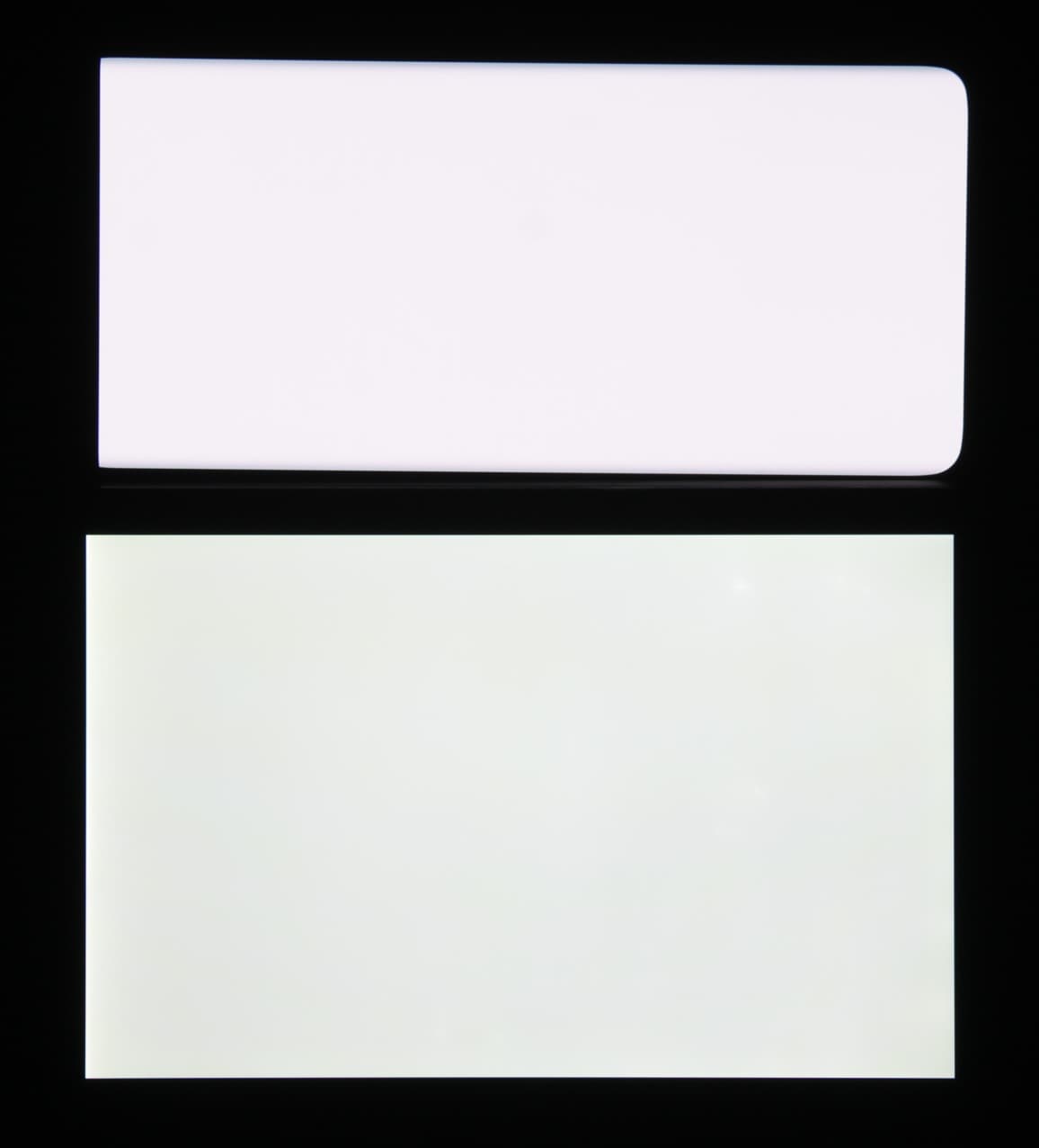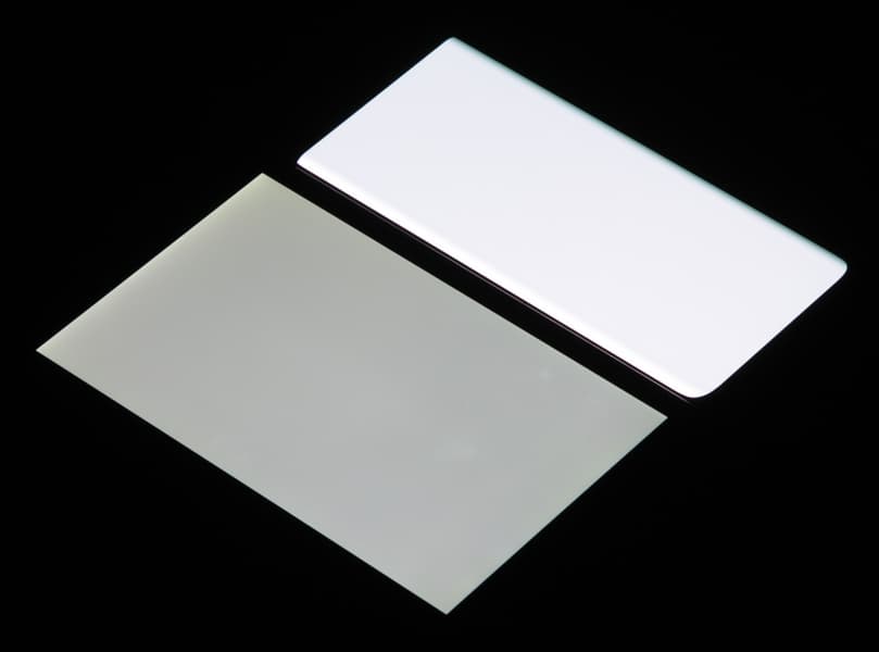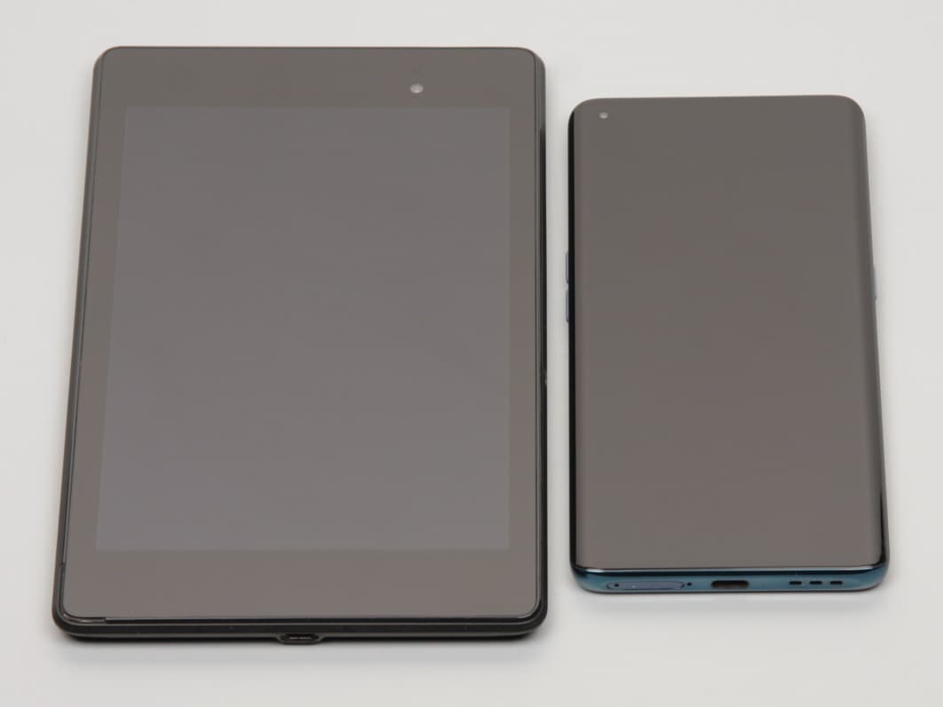 Лицевая поверхность экрана выполнена в виде стеклянной пластины с зеркально-гладкой поверхностью, устойчивой к появлению царапин. Судя по отражению объектов, антибликовые свойства экрана лучше, чем у экрана Google Nexus 7 (2013) (далее просто Nexus 7). Для наглядности приведем фотографию, на которой в выключенных экранах отражается белая поверхность (слева — Nexus 7, справа — Oppo Find X2, далее их можно различать по размеру):