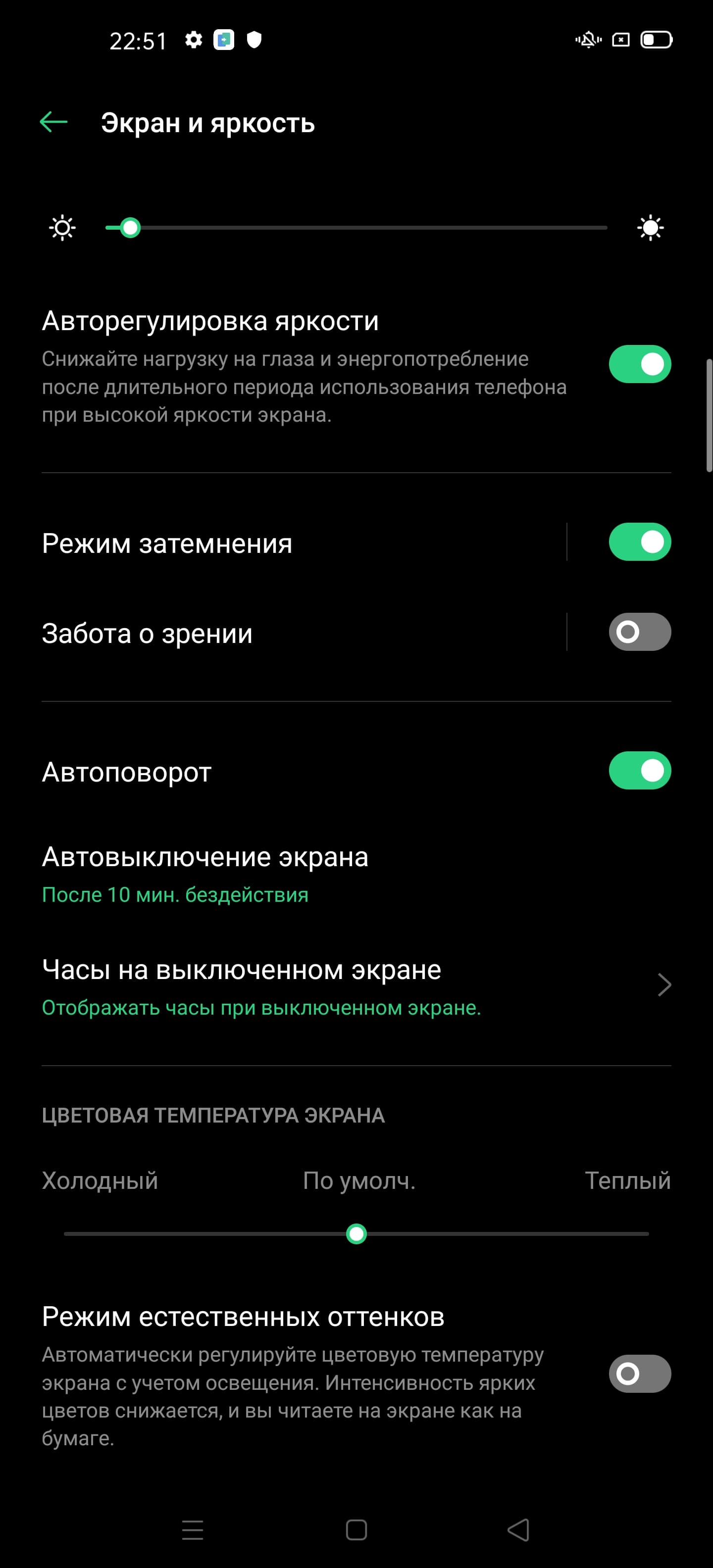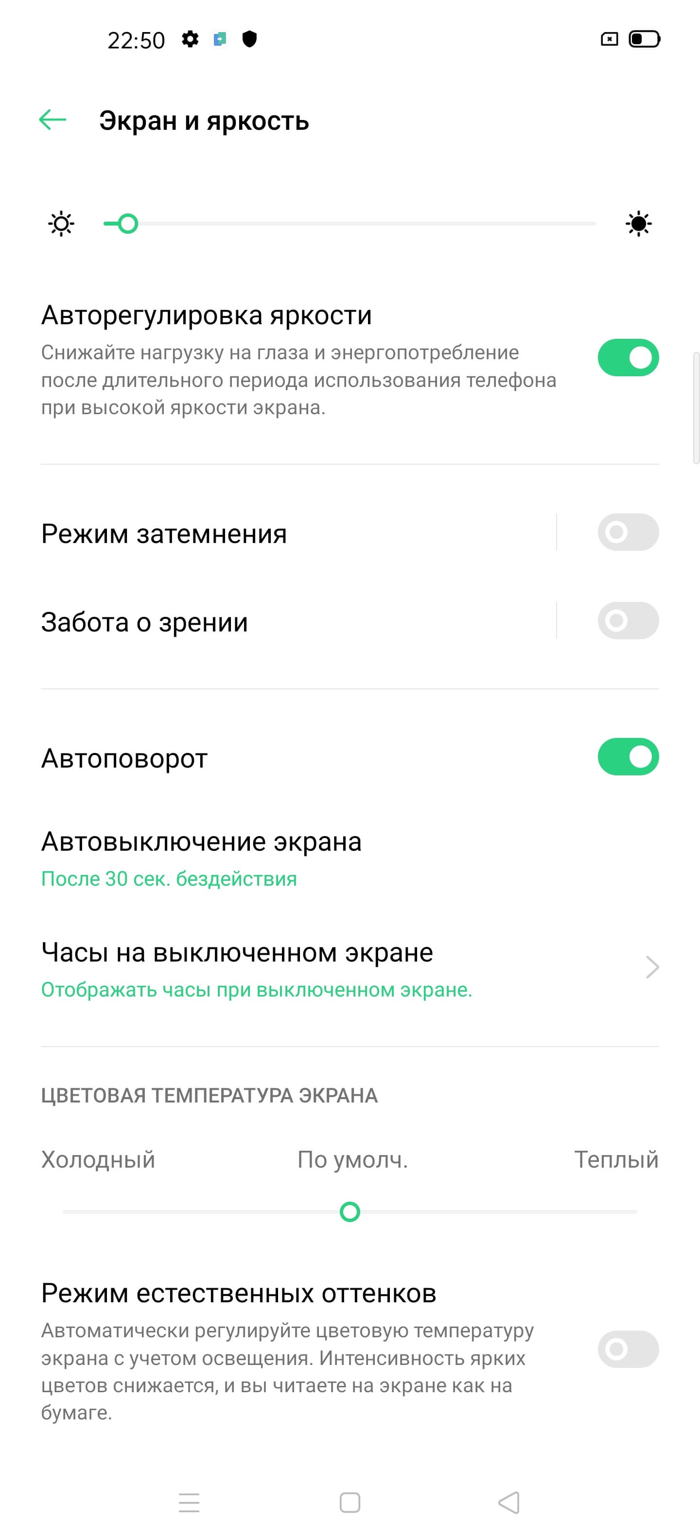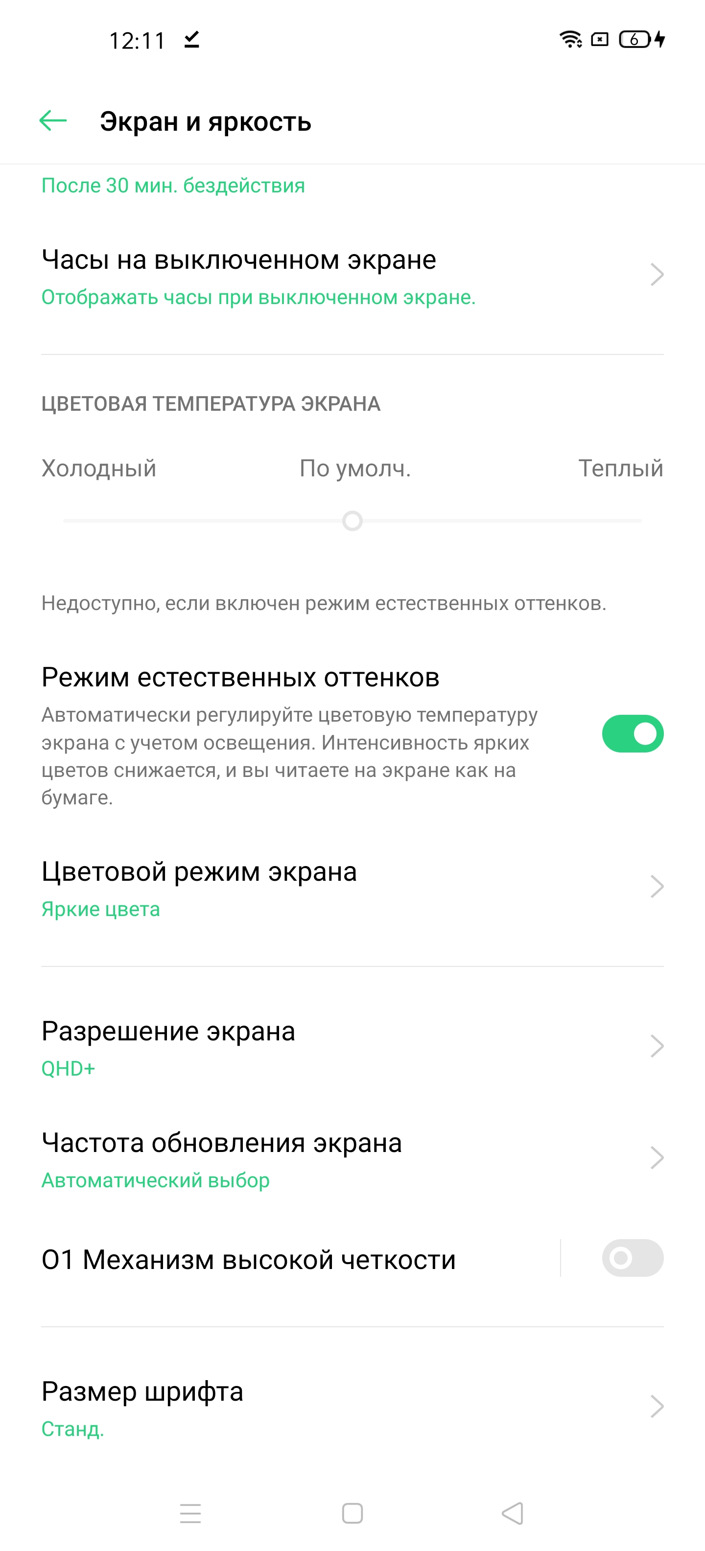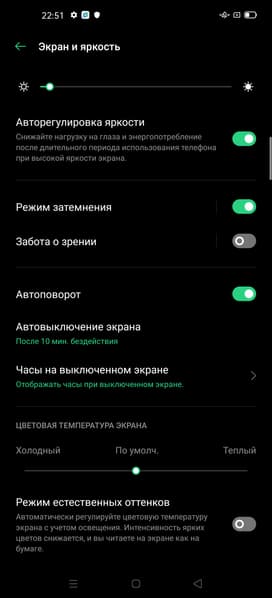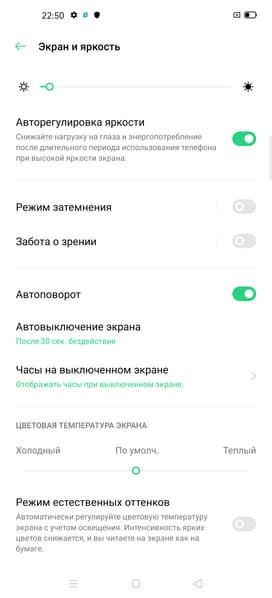 Также есть Режим естественных оттенков, в котором, судя по описанию, должна выполнятся автоматическая подстройка цветового баланса под условия внешнего освещения. Мы его включили и поместили смартфон сначала под светодиодные светильники с холодным белым светом, получив в итоге значения 1,4 для ΔE и 6900 К для цветовой температуры, а потом под галогеновую лампу накаливания (теплый свет), получив 1,5 и 5360 К соответственно. Таким образом, цветовая температура стала ниже, то есть функция работает так, как ожидалось. Отметим, что сейчас сложившимся стандартом является калибровка устройств отображения к точке белого в 6500 К, но в принципе, коррекция под цветовую температуру внешнего света может принести пользу, если хочется добиться лучшего соответствия изображения на экране тому, что видно на бумаге (или на любом носителе, на котором цвета формируются за счет отражения падающего света) в текущих условиях.