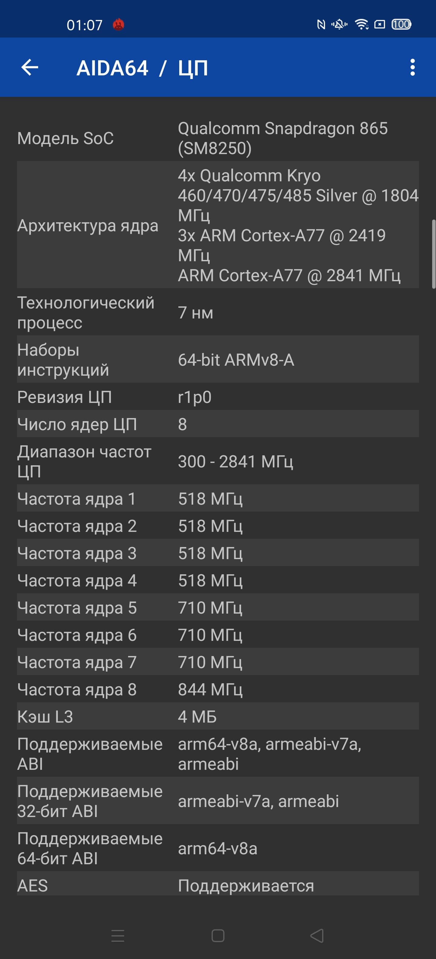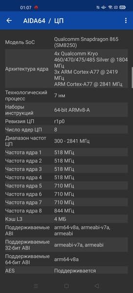 - SoC Qualcomm Snapdragon 865, 8 ядер: 1×Kryo 585 Gold (Cortex-A77) @2,84 ГГц + 3×Kryo 585 Gold (Cortex-A77) @2,42 ГГц + 4×Kryo 585 Silver (Cortex-A55) @1,8 ГГц