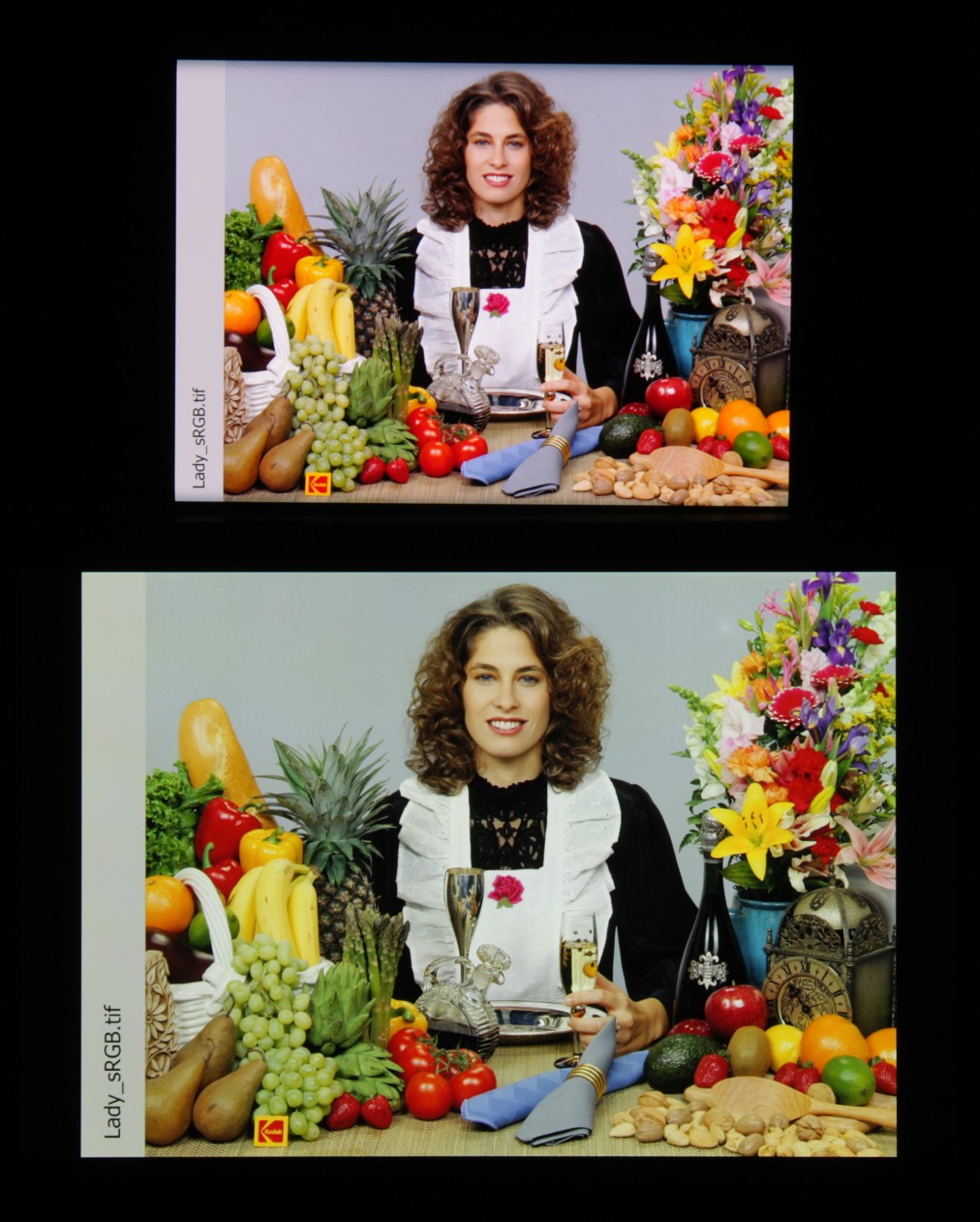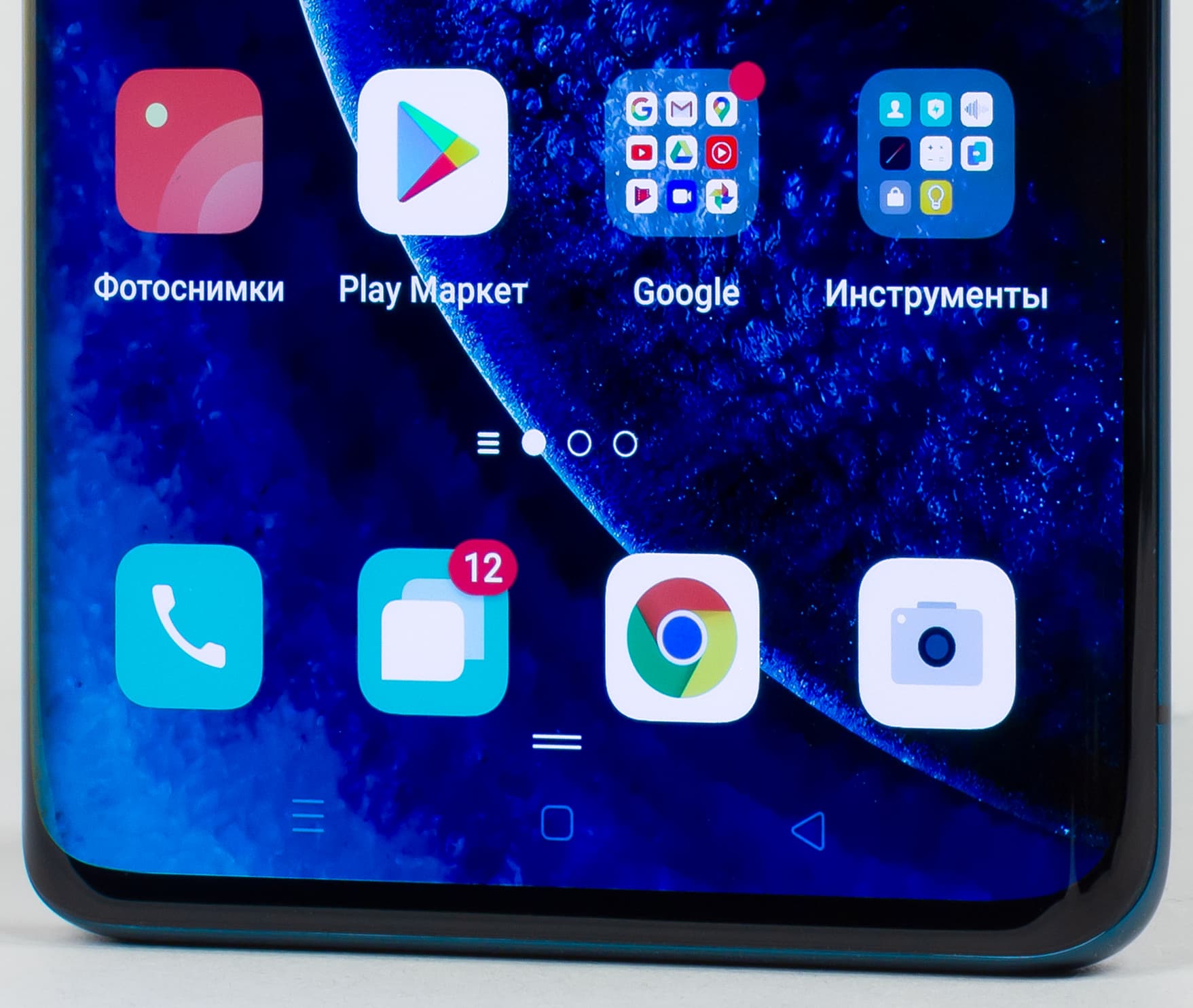Цвета на экране Oppo Find X2 перенасыщены (обратите внимание на помидоры, бананы, салфетку и оттенок лица), а цветовой баланс заметно отличается. Напомним, что фотография не может служить надежным источником сведений о качестве цветопередачи и приводится только для условной наглядной иллюстрации. В частности, выраженный красноватый оттенок белого и серого полей, присутствующий на фотографиях экрана Oppo Find X2, при перпендикулярном взгляде визуально отсутствует, что подтверждается аппаратными тестами с помощью спектрофотометра. Причина в том, что спектральная чувствительность матрицы фотоаппарата неточно совпадает с этой характеристикой человеческого зрения. Заметим, что в данном случае картинка занимает в высоту (при ландшафтной ориентации экрана) всю доступную для вывода изображения область и заходит на загнутые края экрана, что приводит к затемнению и искажению цвета. Также на свету эти области почти всегда бликуют, что еще больше мешает при просмотре изображений, выведенных на весь экран. И даже картинка фильмов с соотношением сторон 16:9 заходит на загибы, что очень мешает при просмотре кино.