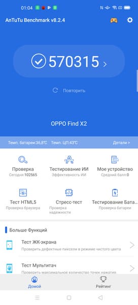 | AnTuTu (v8.x) (больше — лучше) | 570315 | 455506 | 510375 | 488908 | 451054 |