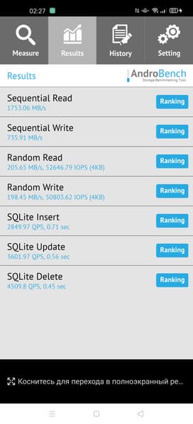 Результаты теста AndroBench на скорость работы с памятью: