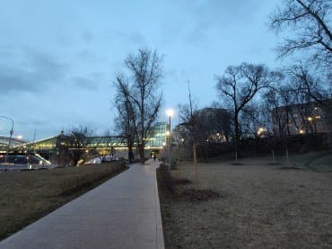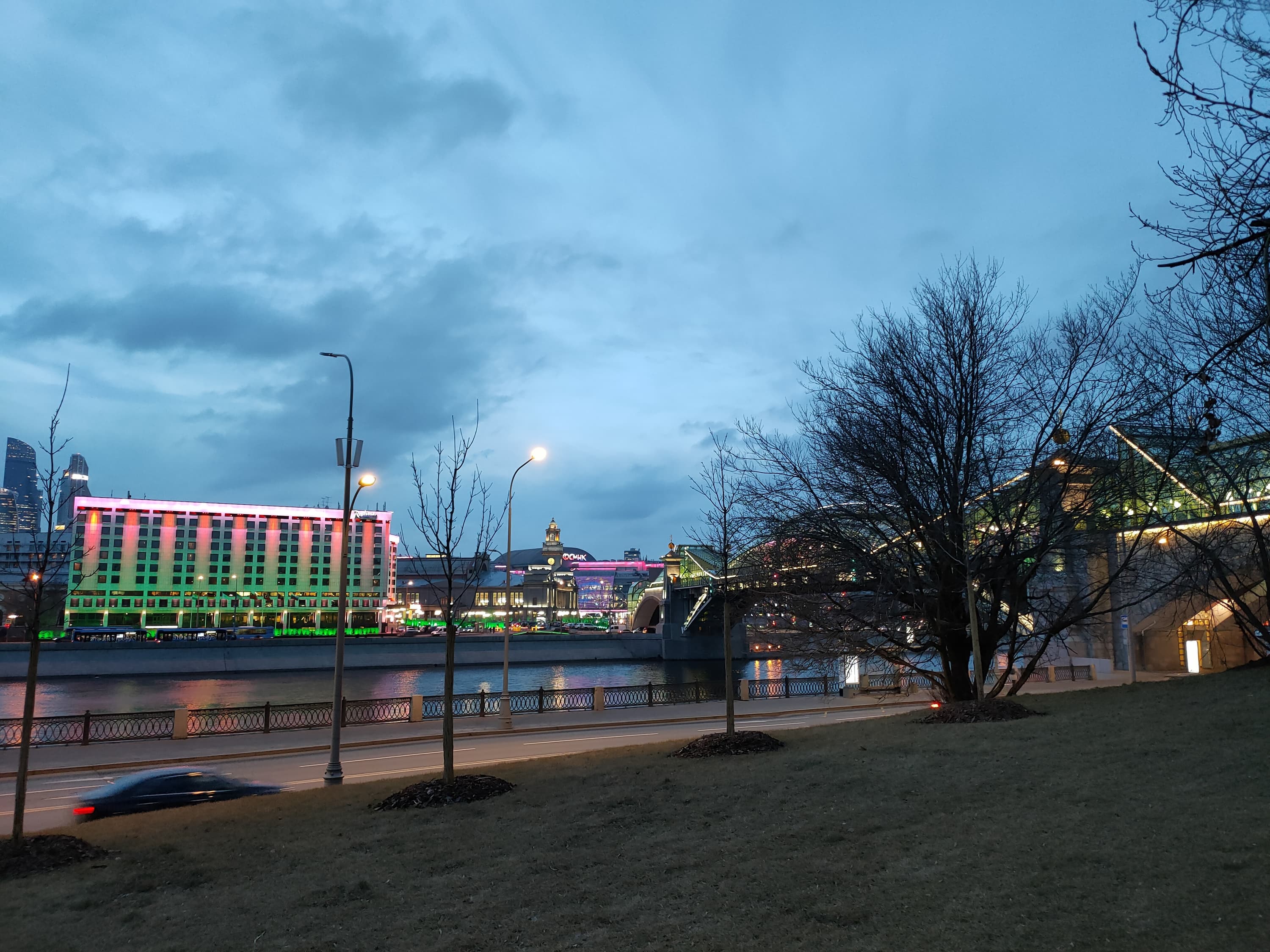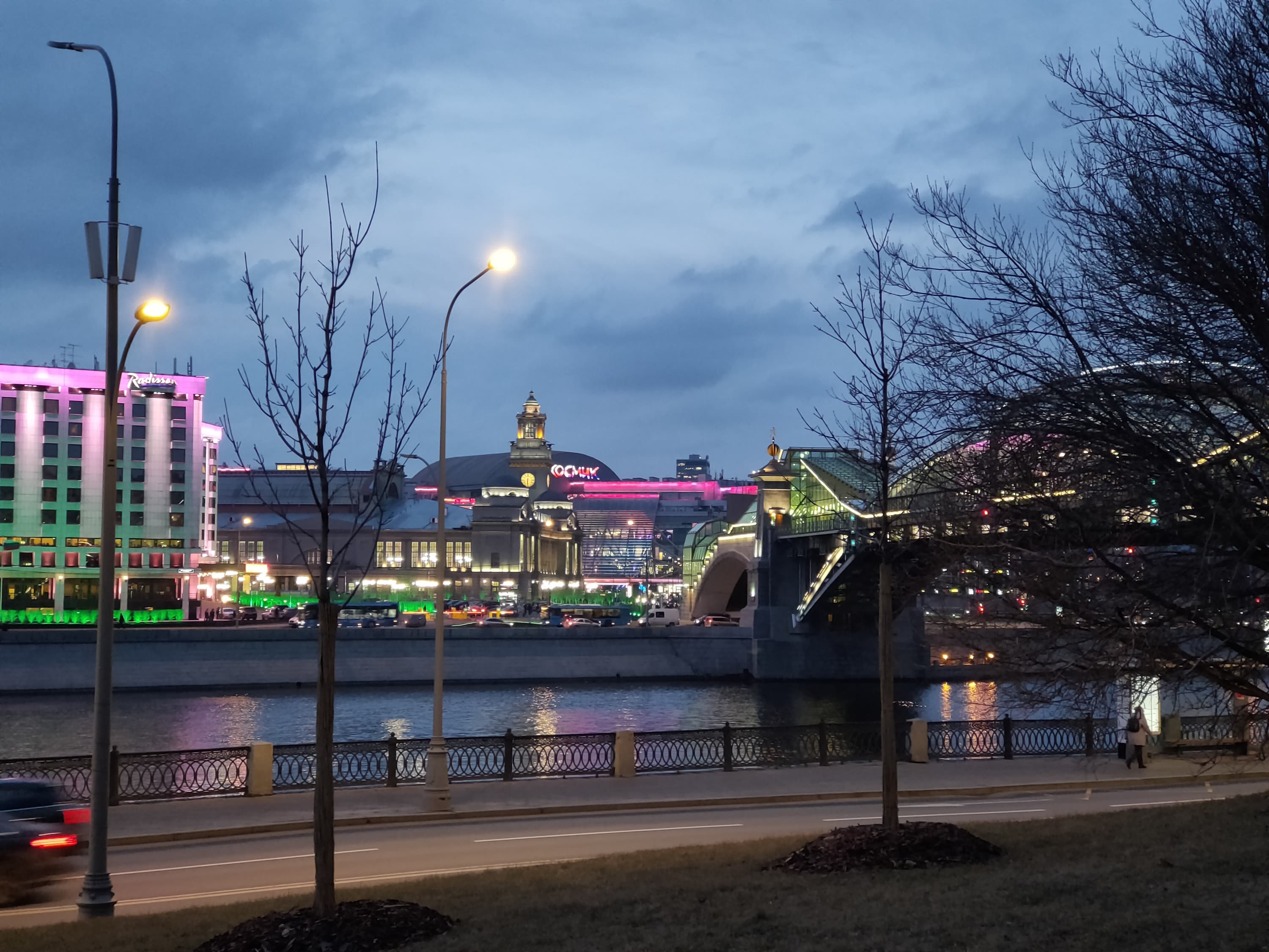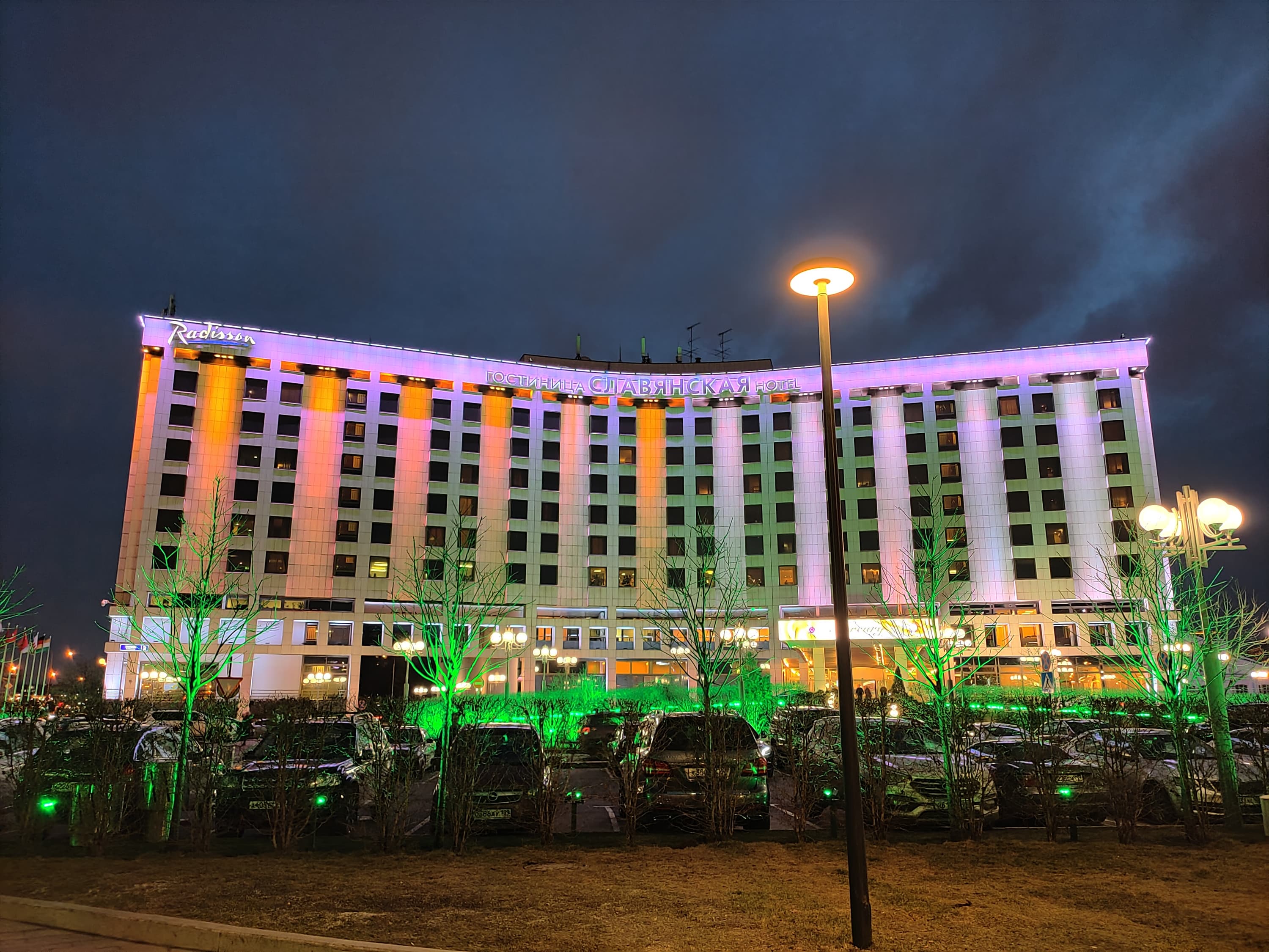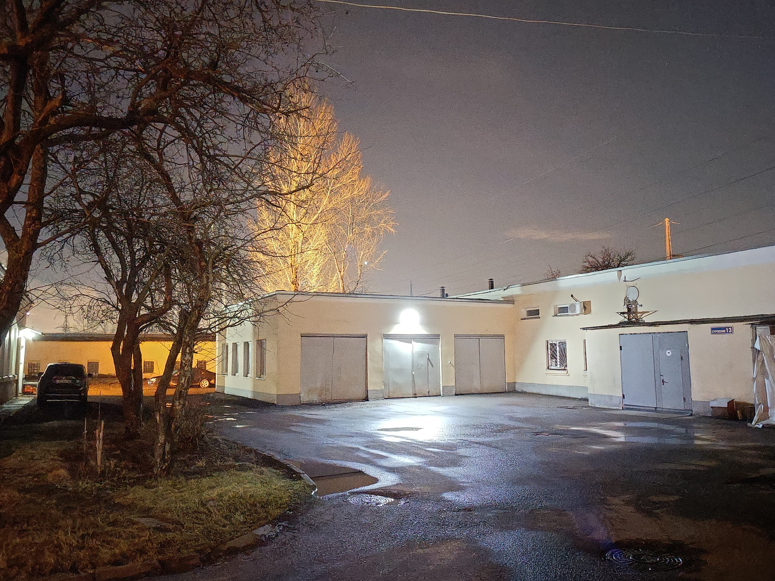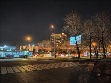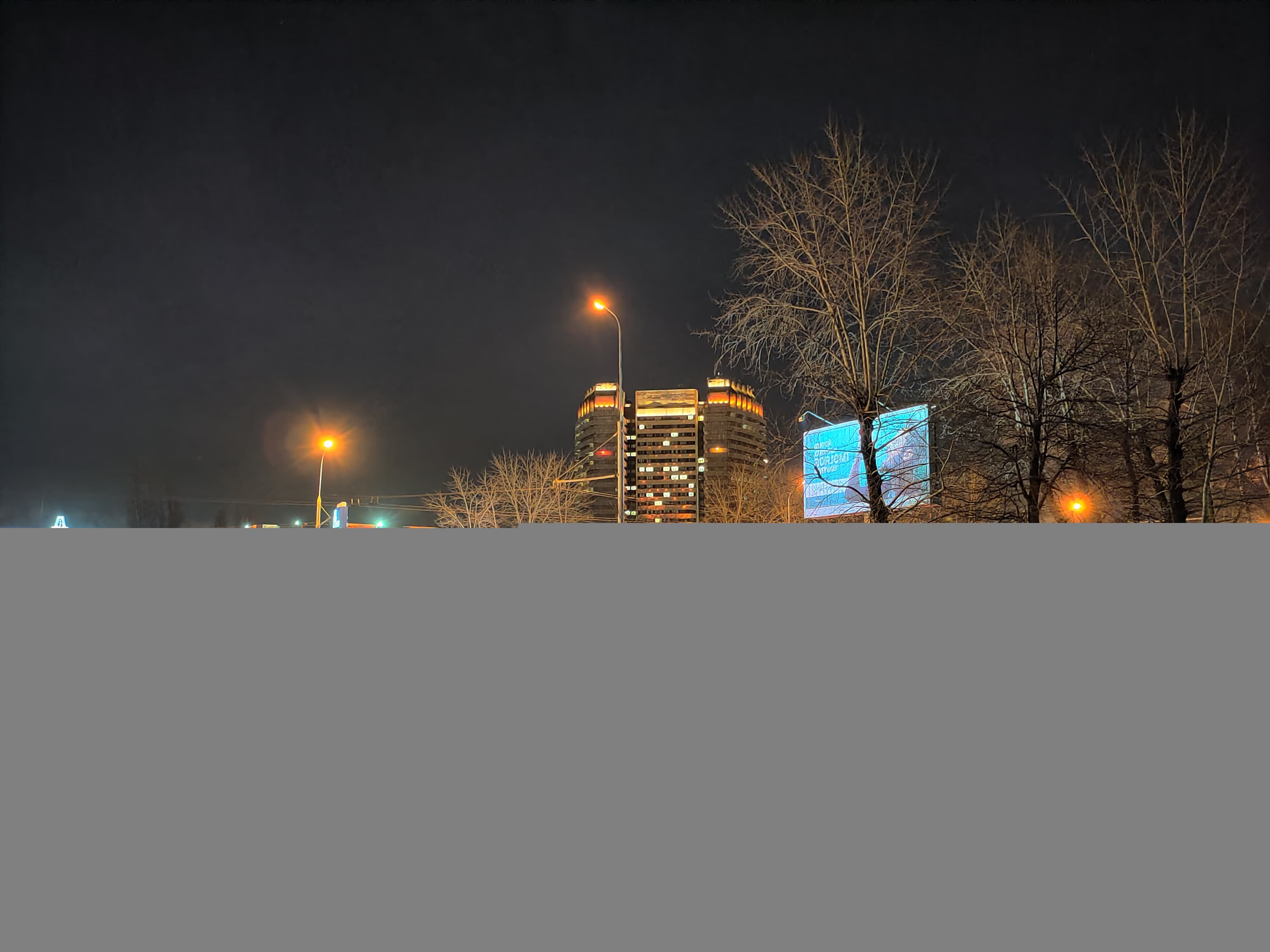 Специальный ночной режим реализован для всех трех камер, но лучше всего снимать, конечно, на основной. Освещенные объекты получаются очень неплохо, особенно если уменьшить снимок, но приличной детализации ночью не получить — а если попытаться добиться ее, детали будут перекрыты толстым слоем шумов.