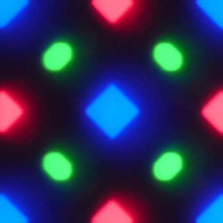 На фрагменте выше можно насчитать 4 зеленых субпикселя, 2 красных (4 половинки) и 2 синих (1 целый и 4 четвертушки), при этом, повторяя эти фрагменты, можно выложить весь экран без разрывов и перехлеста. Для таких матриц компания Samsung ввела наименование PenTile RGBG. Разрешение экрана производитель считает по зеленым субпикселям, по двум другим оно будет в два раза ниже. Разумеется, присутствуют некоторая неровность контрастных границ и другие артефакты. Впрочем, из-за очень высокого разрешения они лишь минимально сказываются на качестве изображения.