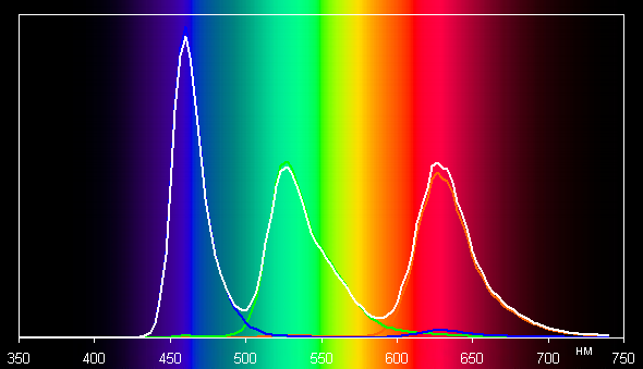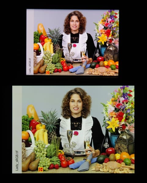 В случае профилей Нежность и Кинематографические баланс оттенков на шкале серого хороший, поскольку цветовая температура близка к стандартным 6500 К, а отклонение от спектра абсолютно черного тела (ΔE) ниже 10, что для потребительского устройства считается неплохим показателем. При этом цветовая температура и ΔE мало изменяются от оттенка к оттенку — это положительно сказывается на визуальной оценке цветового баланса. (Самые темные области шкалы серого можно не учитывать, так как там баланс цветов не имеет большого значения, да и погрешность измерений цветовых характеристик на низкой яркости большая.)