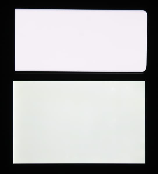 Экран характеризуется великолепными углами обзора. Правда, белый цвет при отклонении даже на небольшие углы поочередно приобретает едва видимый сине-зеленый и розоватый оттенок, но черный цвет остается просто черным под любыми углами. Он настолько черный, что параметр контрастности в данном случае неприменим. Для сравнения приведем фотографии, на которых на экраны Oppo Find X2 и Nexus 7 выведены одинаковые изображения, при этом яркость экранов изначально установлена примерно на 200 кд/м², а цветовой баланс на фотоаппарате принудительно переключен на 6500 К.