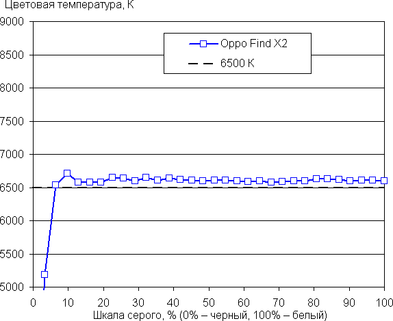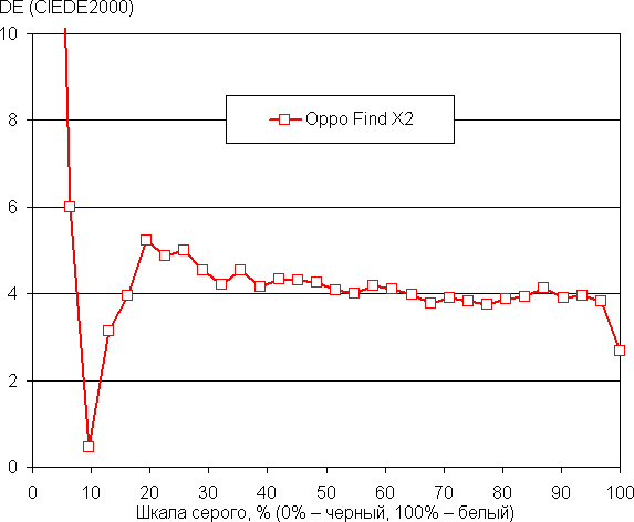 Напомним, что в случае OLED-экранов яркость фрагментов изображения динамично меняется в соответствии с характером выводимого изображения — немного уменьшается для светлых в целом изображений. В итоге полученная зависимость яркости от оттенка (гамма-кривая), скорее всего, не соответствует гамма-кривой статичного изображения, так как измерения проводились при последовательном выводе оттенков серого почти на весь экран.