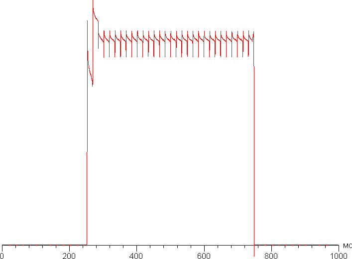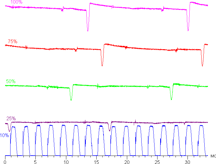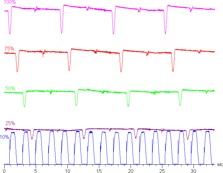 На любом уровне яркости присутствует значимая модуляция с частотой 60,7, 121,5 или 486 Гц. На рисунке ниже приведены зависимости яркости (вертикальная ось) от времени (горизонтальная ось) для нескольких значений настройки яркости. Сначала для режима с частотой обновления 60 Гц: