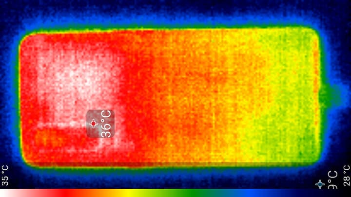 Нагрев больше в верхней части аппарата, что, видимо, соответствует расположению микросхемы SoC. По данным теплокамеры, максимальный нагрев составил всего 36 градусов (при температуре окружающего воздуха в 24 градуса), это относительно немного.
