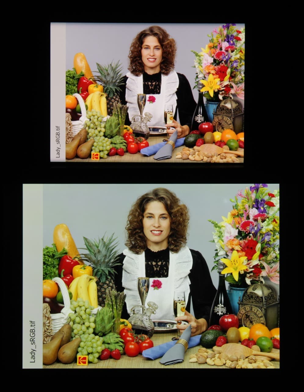 Отметим хорошую равномерность яркости и цветового тона белого поля (за исключением затемнения и изменения оттенка к загнутым краям).