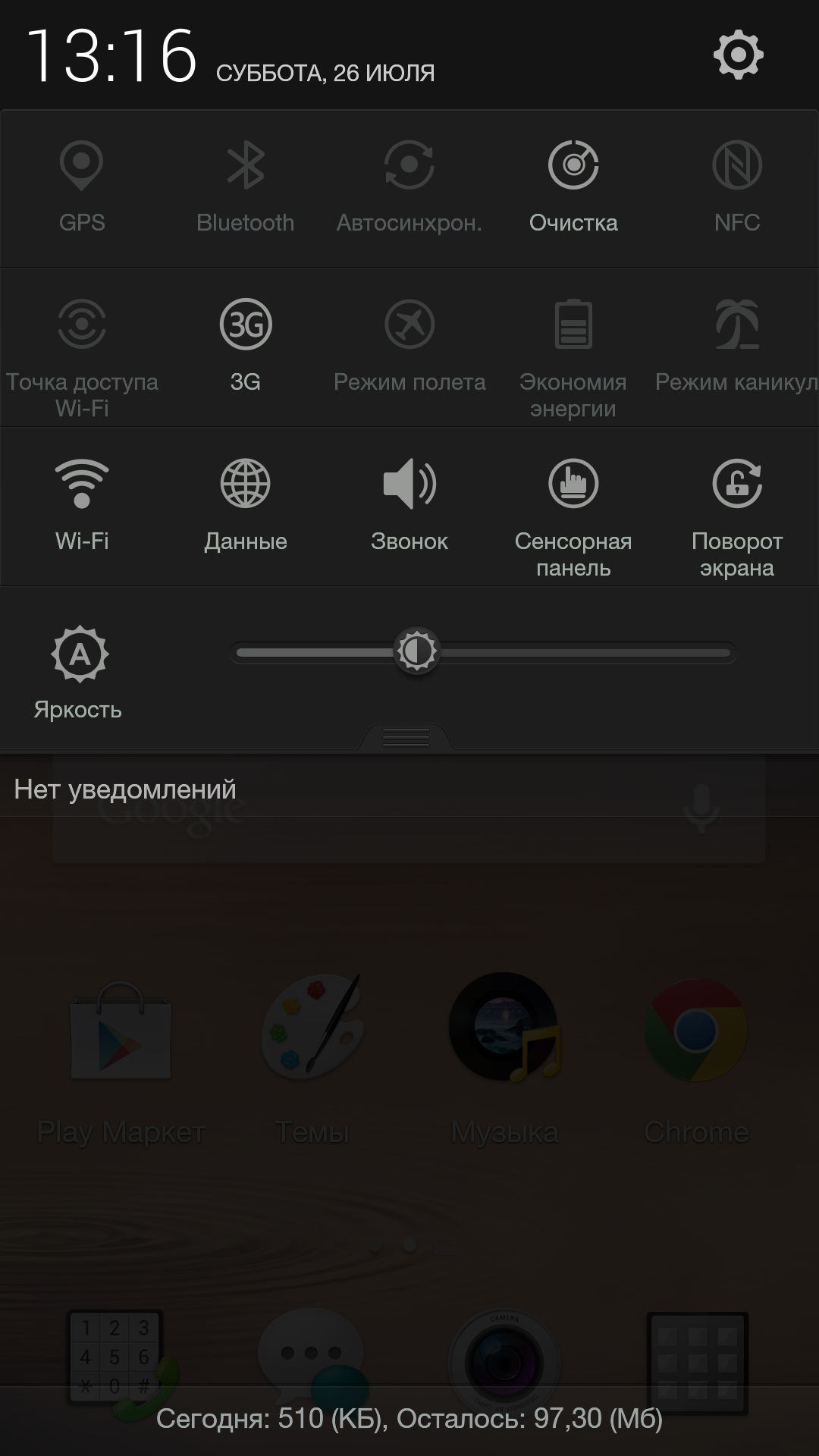 При открытии шторки со строки статуса пользователю будут доступны выключатели различных интерфейсов и сервисов, уведомления и некоторые другие, зависящие от контекста, функции (например, выбор режима подключения по USB или управление аудиоплеером). Заметим, что изменить состав переключателей возможности нет.