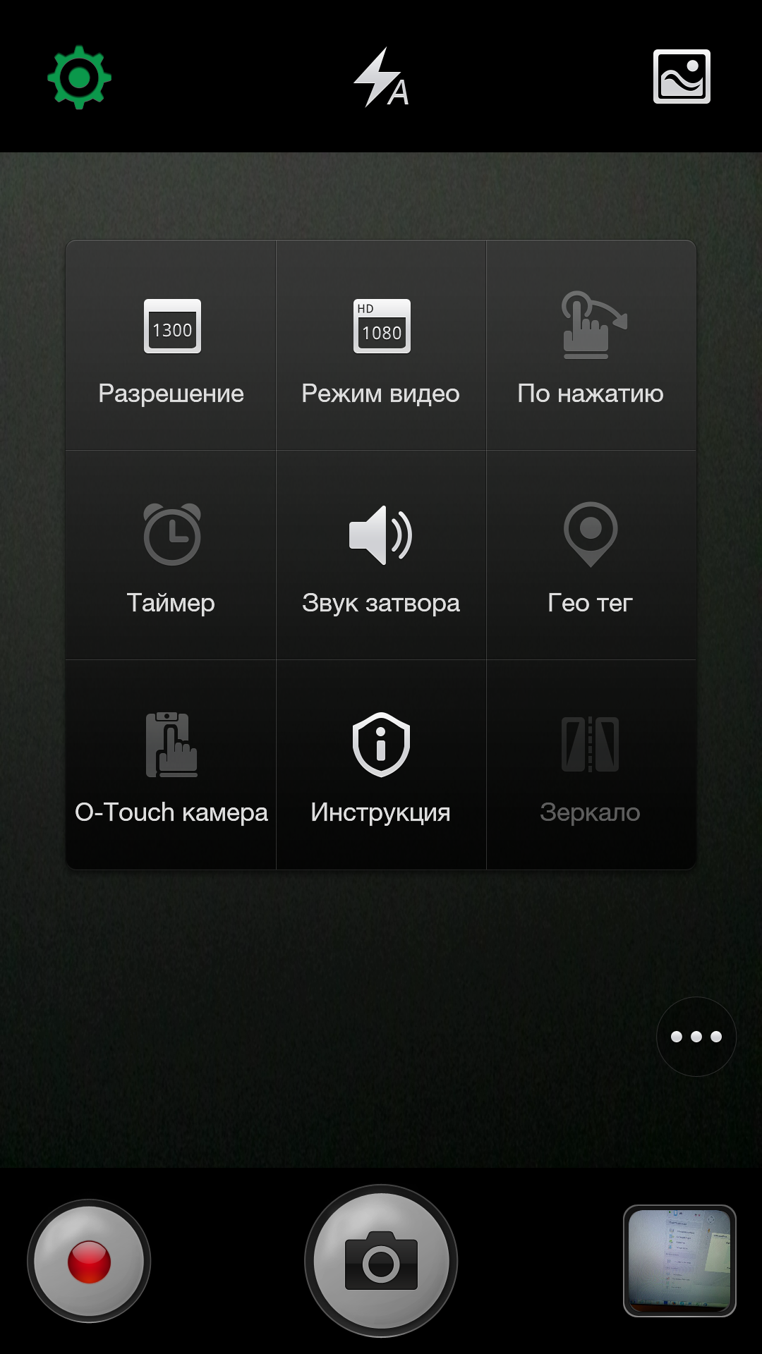 Программа для работы с камерой имеет традиционный интерфейс с отдельными кнопками для съемки фотографий и видео, а также быстрым доступом к настройкам вспышки, сценам, выбору режима съемки (HDR, панорама и другие варианты) и галерее. Для фотосъемки можно использовать не только виртуальную кнопку, но и касание экрана, O-Click, O-Touch или кнопки регулировки громкости.