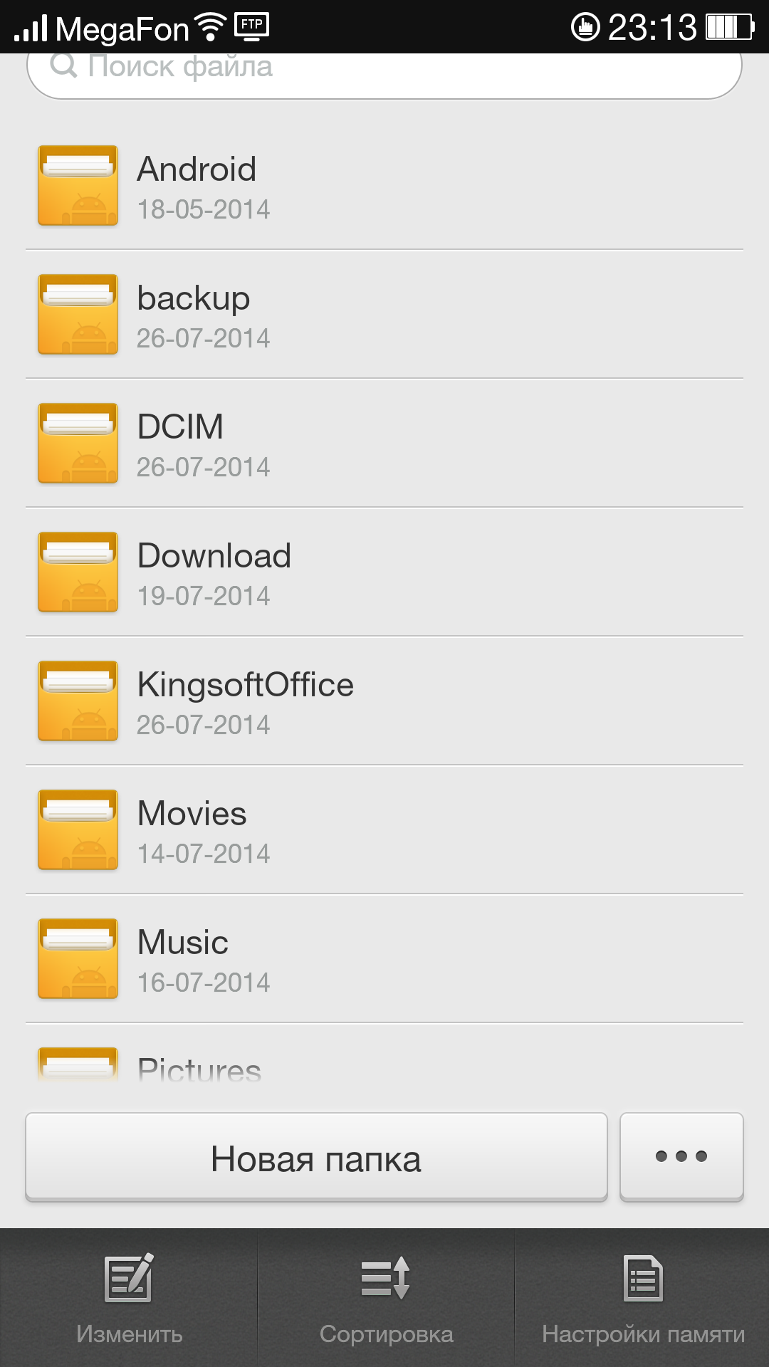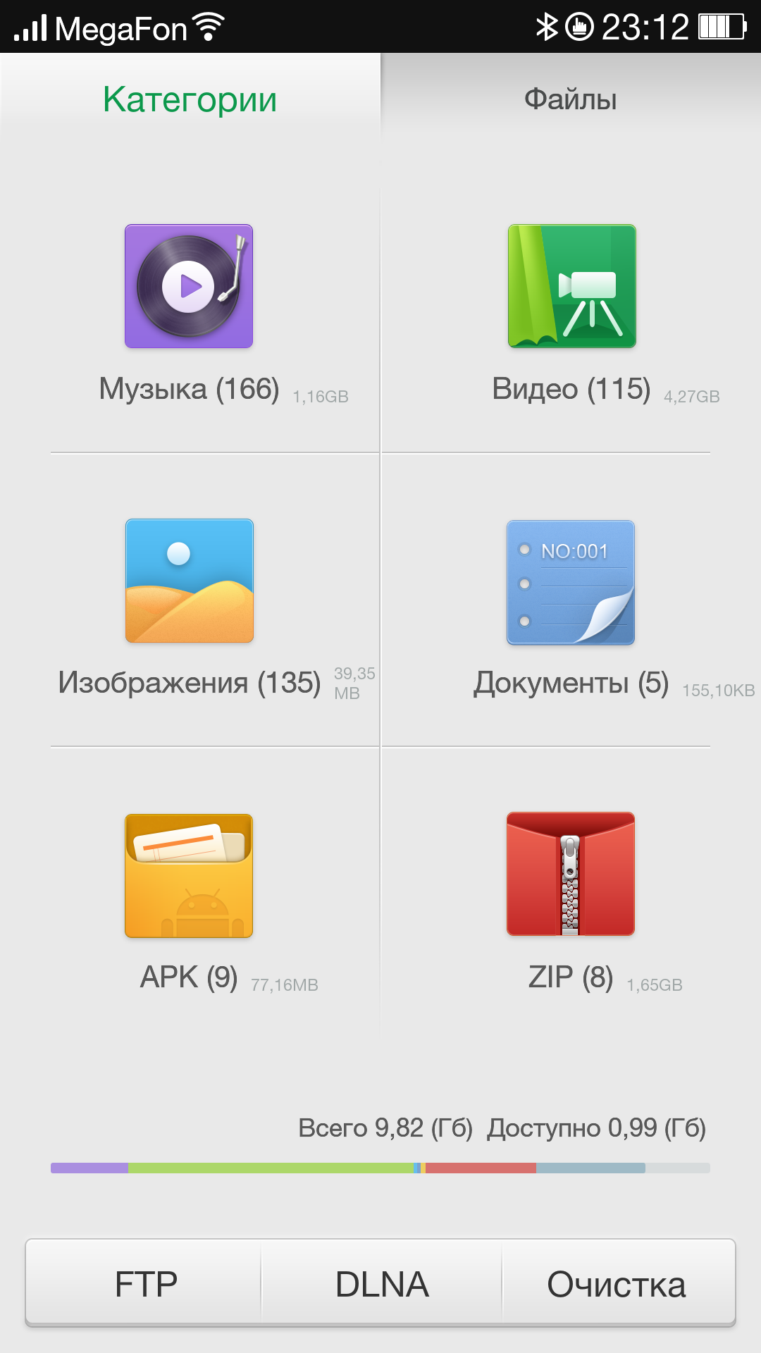 Штатный файловый менеджер поддерживает все популярные операции с файлами, имеет встроенную систему поиска, реализует серверы FTP и DLNA для доступа к файлам смартфона через локальную сеть, умеет работать с архивами некоторых форматов. Также в нем предусмотрен сервис очистки накопителя от не нужных файлов.