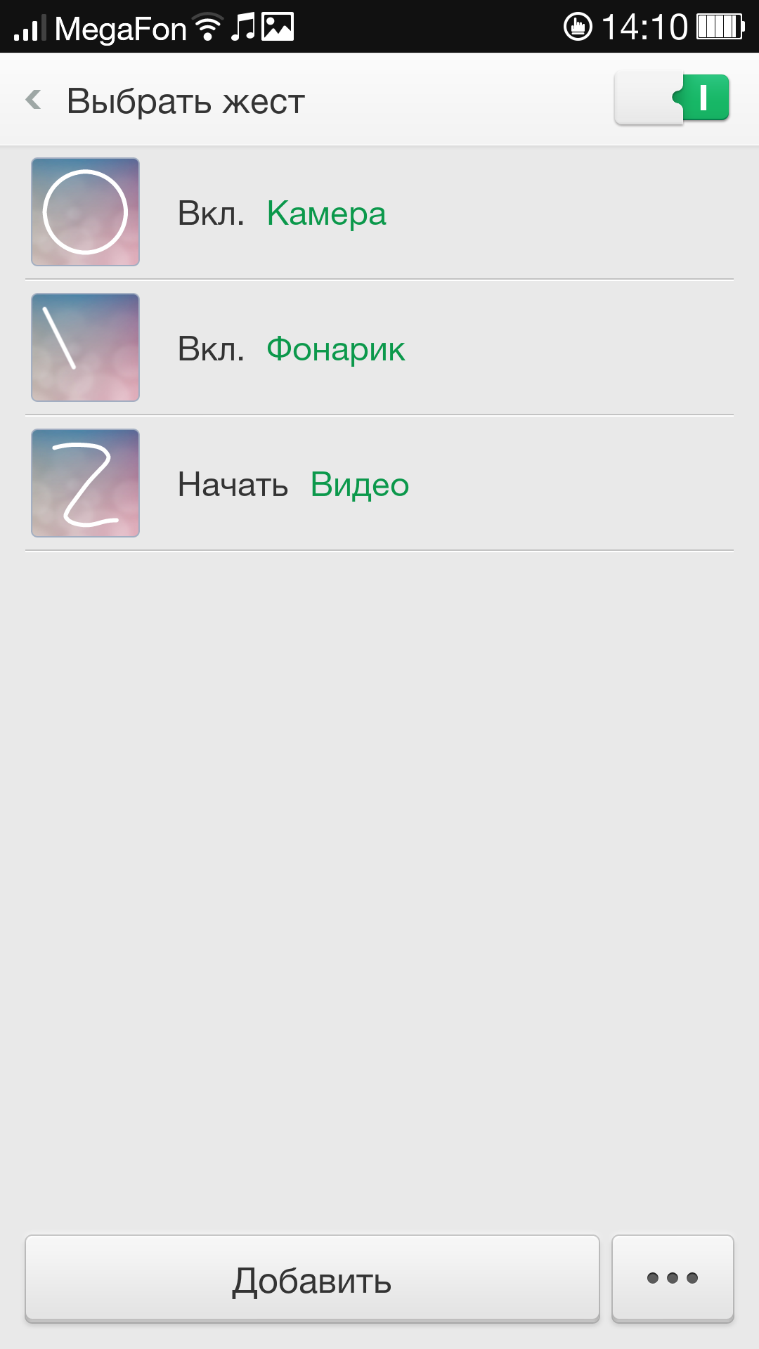 Еще больше возможностей обеспечивает функция «Панель жестов». Если вы открываете шторку не от центра, а слева (или справа), то получаете доступ к настраиваемой панели жестов. В ней можно запрограммировать на собственный жест вызов программ, звонок, отправку SMS, включение камеры, запись видео или другие действия. Также здесь может пригодиться и встроенная утилита «Погасить экран».