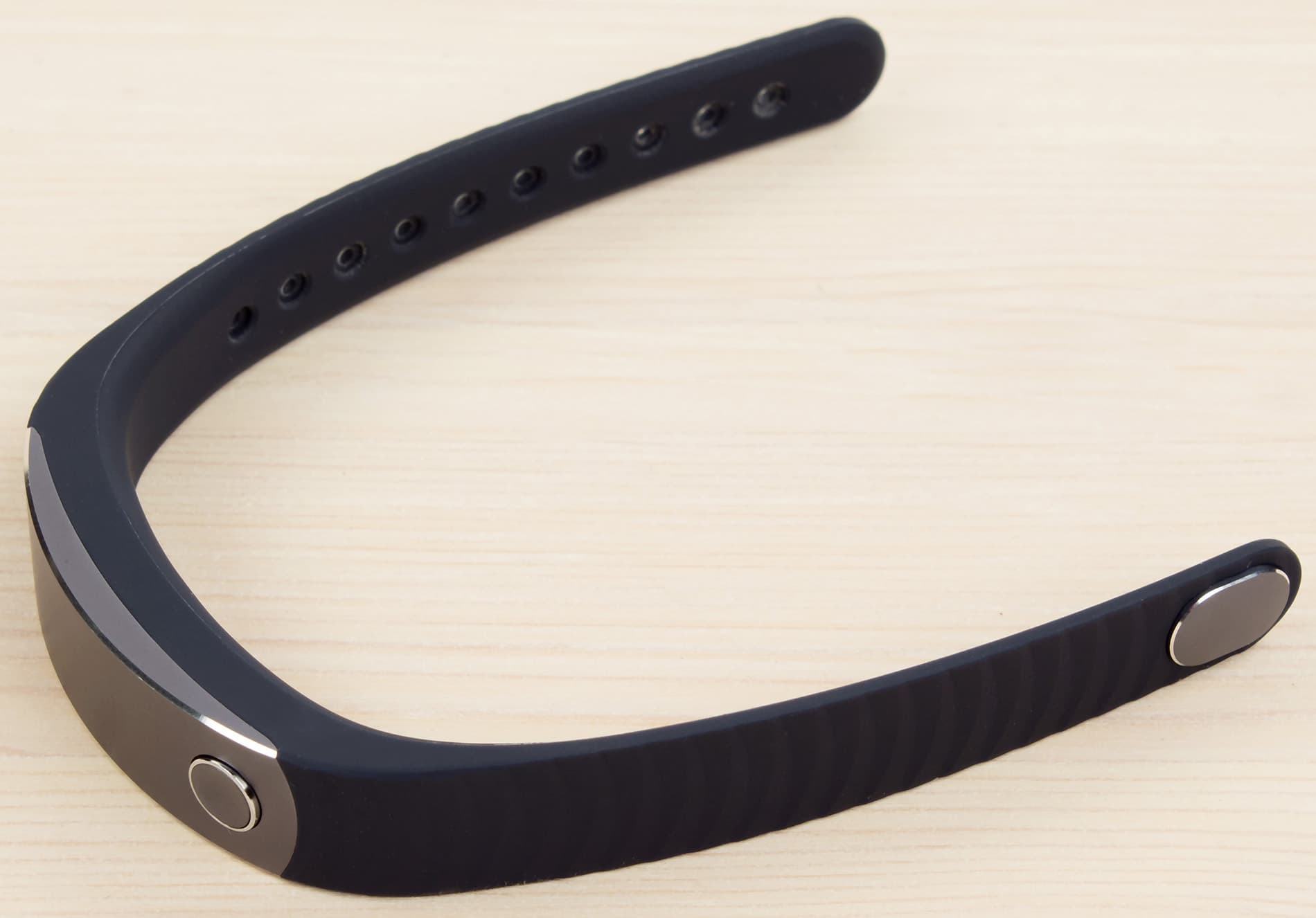 На тыльной стороне браслета — три контакта для подзарядки, а также отверстия в ремешке для фиксации браслета на зарядном блоке. Что касается отверстий для фиксации браслета на руке, то их достаточно даже для комфортного ношения на очень тонкой руке. А вот обладателям крупных запястий может быть не так комфортно, поскольку браслет в целом довольно миниатюрный.