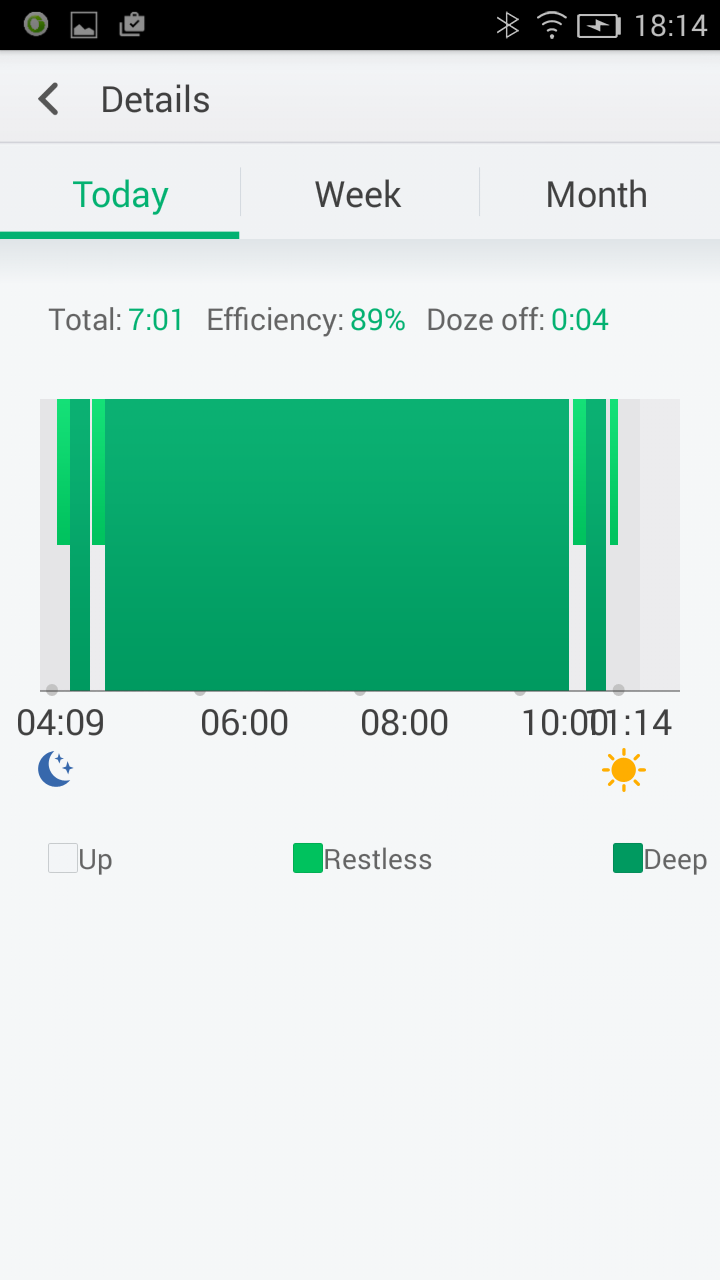 Вообще, функция отслеживания сна вызвала у нас много нареканий. Во-первых, браслет не в состоянии сам определить, что мы легли спать — для старта отслеживания сна необходимо нажать кнопку на браслете (два раза: сначала — трехсекундное нажатие, затем короткое нажатие). Во-вторых, сам мониторинг сна дает очень странные результаты. На скриншоте выше видно, что браслет счел, будто спящий человек находился в режиме глубокого сна непрерывно около шести часов. Это физиологически невозможно: во время сна у человека чередуются фазы, и хорошо, если в течение семичасового сна будет три-четыре часа глубокого сна. Таким образом, показанным результатам нельзя доверять. Видимо, точность акселерометра не очень высокая (например, он не реагирует на небольшие движения рукой во время сна) или же ПО трактует показания акселерометра неверно.