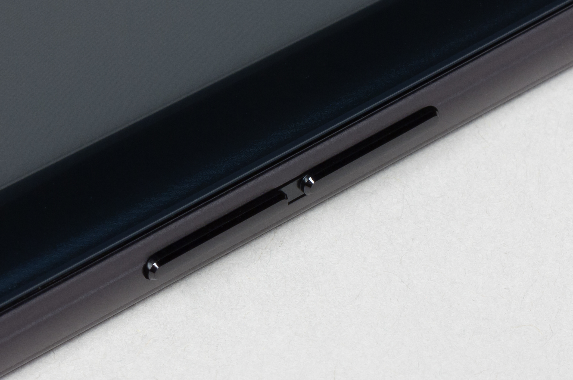 Лицевая поверхность экрана выполнена в виде стеклянной пластины с зеркально-гладкой поверхностью, устойчивой к появлению царапин. Судя по отражению объектов, антибликовые свойства экрана не хуже, чем у экрана Google Nexus 7 (2013) (далее просто Nexus 7). Для наглядности приведем фотографию, на которой в выключенных экранах отражается белая поверхность (слева — Nexus 7, справа — Oppo Reno 10x zoom, далее их можно различать по соотношению сторон экрана):