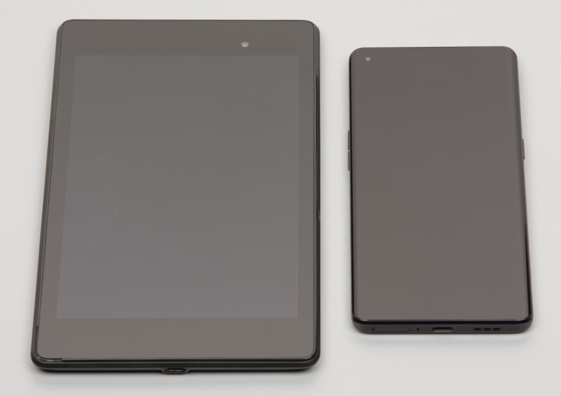 Лицевая поверхность экрана выполнена в виде стеклянной пластины с зеркально-гладкой поверхностью, устойчивой к появлению царапин. Судя по отражению объектов, антибликовые свойства экрана лучше, чем у экрана Google Nexus 7 (2013) (далее просто Nexus 7). Для наглядности приведем фотографию, на которой в выключенных экранах отражается белая поверхность (слева — Nexus 7, справа — Oppo Reno3 Pro, далее их можно различать по размеру):