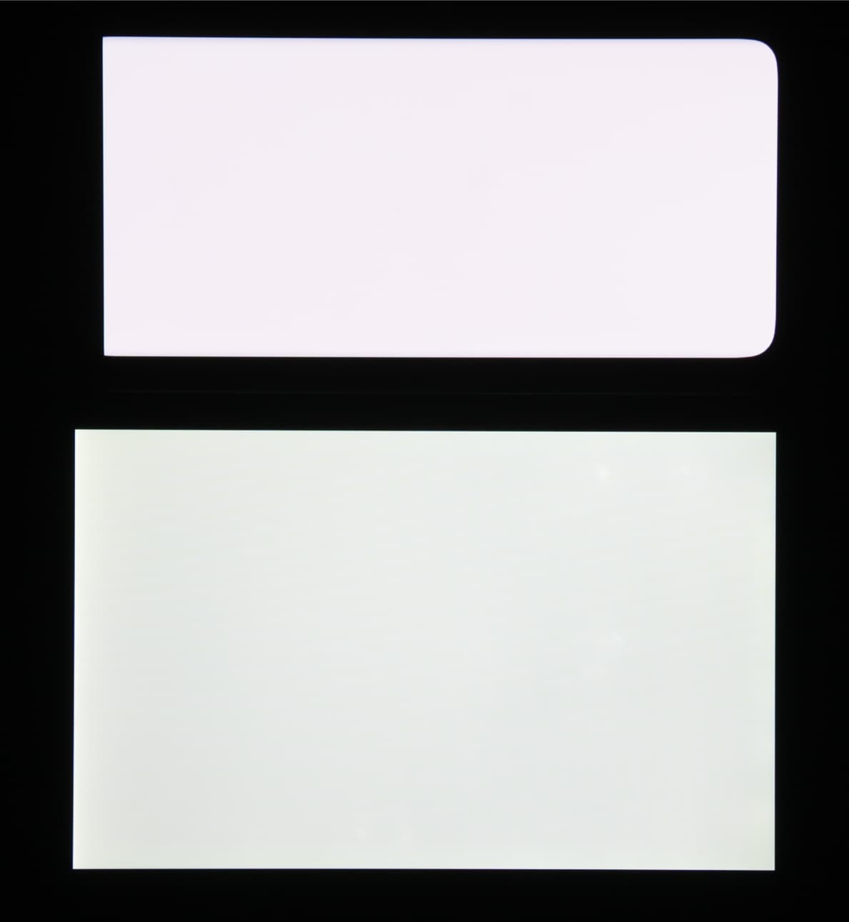 Экран характеризуется великолепными углами обзора. Правда, белый цвет при отклонении даже на небольшие углы поочередно приобретает едва видимый сине-зеленый и розоватый оттенок, но черный цвет остается просто черным под любыми углами. Он настолько черный, что параметр контрастности в данном случае неприменим. Для сравнения приведем фотографии, на которых на экраны Oppo Reno3 Pro и Nexus 7 выведены одинаковые изображения, при этом яркость экранов изначально установлена примерно на 200 кд/м², а цветовой баланс на фотоаппарате принудительно переключен на 6500 К.
